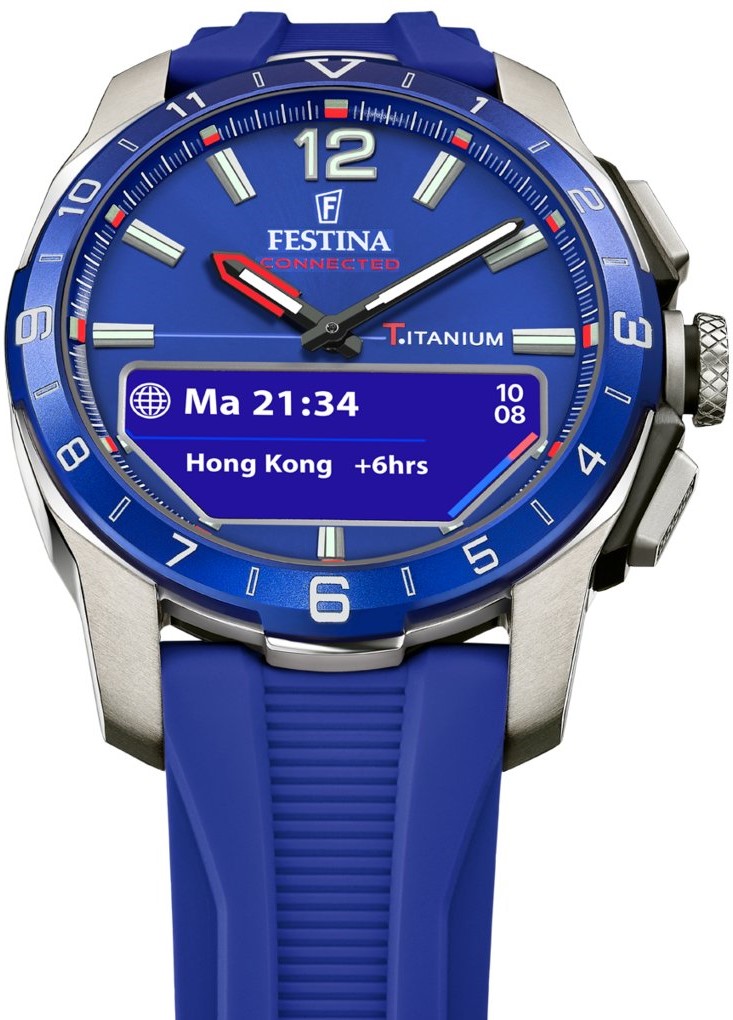 Festina Connected D 23000/3 jsou pánské chytré sportovní hodinky na modrém silikonovém řemínku s trnovou sponou. Pouzdro z titanu má průměr 44 milimetrů. Kombinovaný modrý číselník s červenými detaily je chráněn odolným safírovým sklem. Vodotěsnost hodinek činí 3 ATM a jsou tedy odolné proti dešti a při mytí rukou. Plně nabité hodinky mají výdrž baterie až 10 dní a upozorní vás, že je čas hodinky nabít. Hodinky je možné propojit s vaším smartphonem pomocí aplikace Festina Connected, která je k dispozici pro systémy Android a iOS. Vynikají tím, že na první pohled nepůsobí jako běžné chytré hodinky, avšak mohou kromě Bluetooth nabídnout hned 17 užitečných funkcí podrobně popsaných níže. Patří mezi ně např.: krokoměr, timer, stopky, budík, ovládání hudby a spoustu dalších.