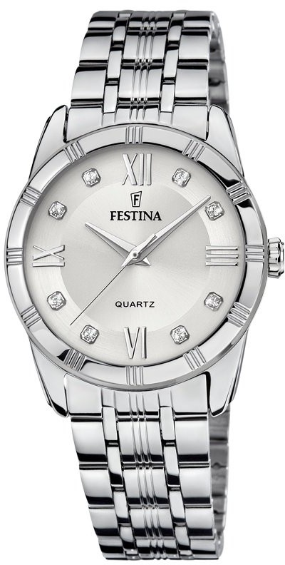 Festina Mademoiselle 16940/A jsou dámské bateriové hodinky v klasickém stylu na ocelovém náramku s překlápěcí sponou. Pouzdro z nerezové oceli má průměr 32 milimetrů. Stříbrný číselník s efektem slunečního brusu zdobený 8 čirými zirkony je chráněn odolným minerálním sklíčkem. Pohon hodinek zajišťuje quartzový strojek Miyota 2036 s přesností ±20 sekund za měsíc. S vodotěsností 5 ATM jsou hodinky odolné proti dešti a při sprchování.