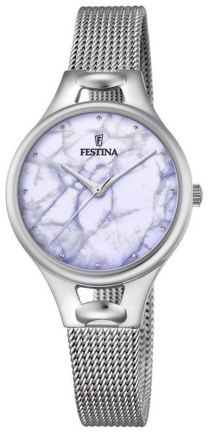 Festina Mademoiselle 16950/F jsou dámské bateriové hodinky na ocelovém milánském tahu s posuvnou sponou. Pouzdro z nerezové oceli má průměr 32 milimetrů. Modrý číselník s mramorovým vzorem je chráněn odolným minerálním sklíčkem. Pohon hodinek zajišťuje quartzový strojek Miyota 2035 s přesností ±20 sekund za měsíc. S vodotěsností 5 ATM jsou hodinky odolné proti dešti a při sprchování.
