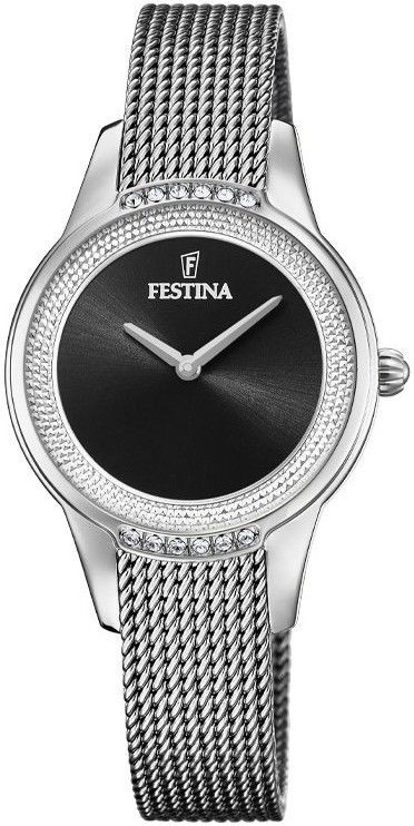 Festina Mademoiselle 20494/3 jsou dámské bateriové hodinky na ocelovém milánském tahu s posuvnou sponou. Pouzdro z nerezové oceli má průměr 30,2 milimetru a lunetu zdobenou čirými zirkony. Černý číselník s efektem slunečního brusu je chráněn odolným minerálním sklíčkem. Pohon hodinek zajišťuje quartzový strojek Miyota GL20 s přesností ±20 sekund za měsíc. S vodotěsností 5 ATM jsou hodinky odolné proti dešti a při sprchování.