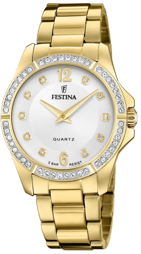 Festina Mademoiselle 20596/1 jsou dámské bateriové hodinky v klasickém stylu na ocelovém náramku s PVD úpravou ve zlaté barvě a překlápěcí sponou. Pouzdro z nerezové oceli ve stejné barvě má průměr 34,5 milimetru a lunetu zdobenou čirými zirkony. Stříbrný číselník s efektem slunečního brusu zdobený 10 zirkony je chráněn odolným minerálním sklíčkem. Pohon hodinek zajišťuje quartzový strojek Miyota 2025 s přesností ±20 sekund za měsíc. S vodotěsností 5 ATM jsou hodinky odolné proti dešti a při sprchování.