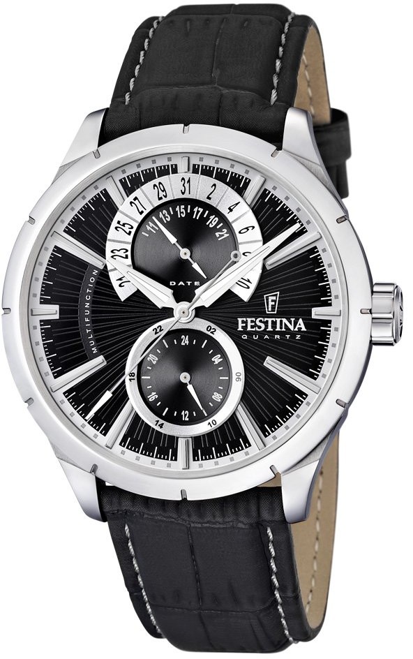 Festina Retro 16573/3 jsou pánské elegantní bateriové hodinky na černém koženém řemínku s trnovou sponou. Pouzdro z nerezové oceli má průměr 46 milimetrů. Černý číselník s radiální strukturou, ukazatelem data a zobrazením času ve 24hodinovém formátu je chráněn minerálním sklíčkem. Hodinky pohání quartzový strojek Miyota 6P73. S vodotěsností 5 ATM jsou odolné proti dešti a při sprchování.