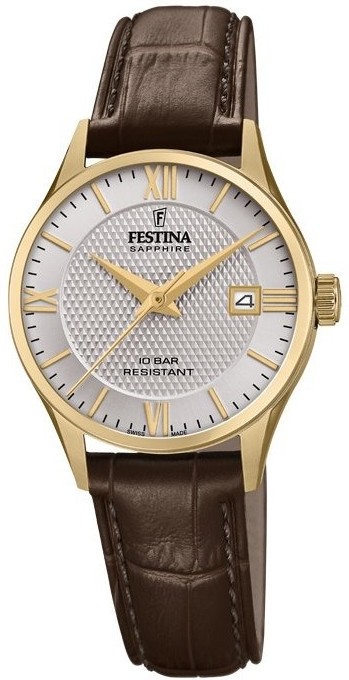 Festina Swiss Made 20011/2 jsou dámské elegantní bateriové hodinky na hnědém koženém řemínku s trnovou sponou. Pouzdro z nerezové oceli s PVD úpravou zlaté barvy má průměr 29 milimetrů. Stříbrný číselník se středem zdobeným giloší a ukazatelem data na třetí hodině je chráněn odolným safírovým sklíčkem. Chod hodinek zajišťuje quartzový strojek Ronda 775-3H201BL. S vodotěsností 10 ATM jsou hodinky vhodné pro plavání či šnorchlování.