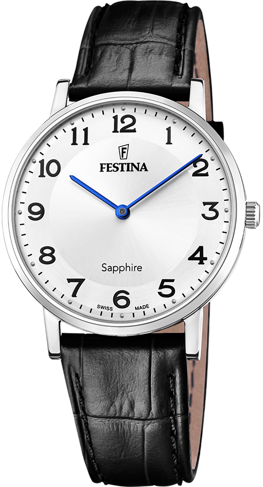 Festina Swiss Made 20012/5 jsou pánské elegantní bateriové hodinky na černém koženém řemínku s trnovou sponou. Pouzdro z nerezové oceli má průměr 39,3 milimetru. Přehledný stříbrný číselník s efektem slunečního brusu je chráněn odolným safírovým sklíčkem. Chod hodinek zajišťuje quartzový strojek Ronda 762-H1. S vodotěsností 5 ATM jsou hodinky odolné proti dešti a při sprchování.