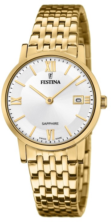 Festina Swiss Made 20021/1 jsou dámské bateriové hodinky v klasickém stylu na ocelovém náramku s povrchovou PVD úpravou zlaté barvy a překlápěcí sponou. Pouzdro z nerezové oceli ve stejné barvě má průměr 29,3 milimetru. Přehledný stříbrný číselník s efektem slunečního brusu a ukazatelem data na třetí hodině je chráněn odolným safírovým sklíčkem. Chod hodinek zajišťuje quartzový strojek Ronda 784-3H101BL. S vodotěsností 5 ATM jsou hodinky odolné proti dešti a při sprchování.