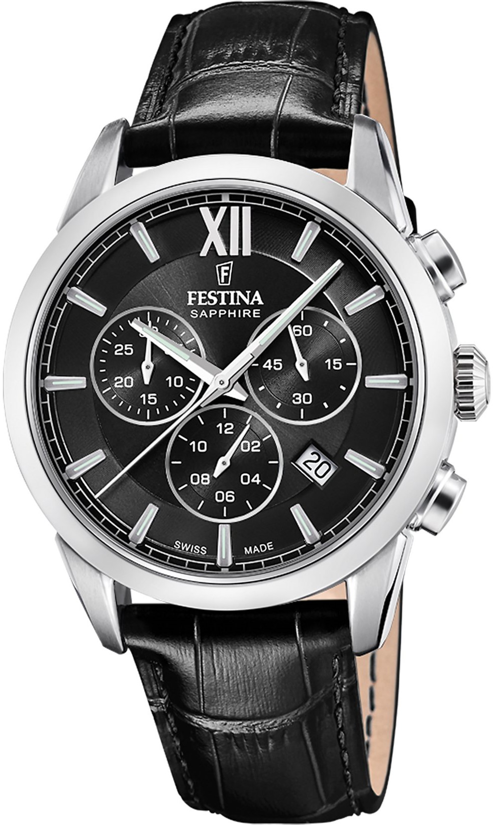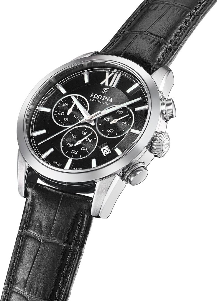 Festina Swiss Made 20041/4 jsou pánské sportovně-elegantní bateriové hodinky na černém koženém řemínku s trnovou sponou. Pouzdro z nerezové oceli má průměr 41 milimetrů. Černý číselník s efektem slunečního brusu, datumovkou a stopkami je chráněn odolným safírovým sklíčkem. Aplikované indexy mají spolu s ručkami luminiscenční nátěr, který po nasvícení usnadňuje čitelnost za zhoršených světelných podmínek. Chod hodinek zajišťuje quartzový strojek Ronda 5030.D. S vodotěsností 10 ATM jsou hodinky vhodné pro plavání či šnorchlování.