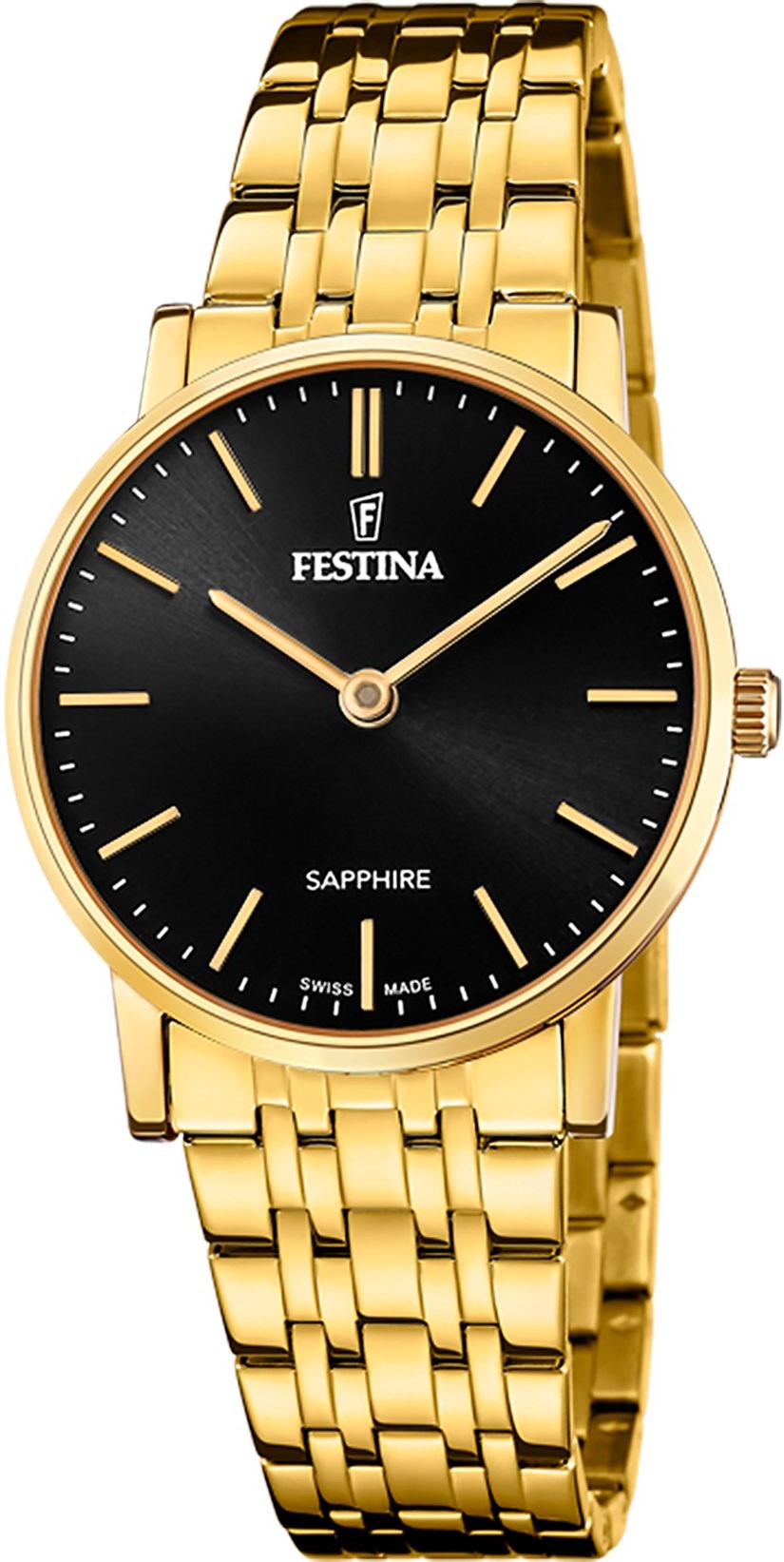 Festina Swiss Made 20048/4 jsou dámské bateriové hodinky v klasickém stylu na ocelovém náramku s povrchovou PVD úpravou zlaté barvy a překlápěcí sponou. Pouzdro z nerezové oceli ve stejné barvě má průměr 29,3 milimetru. Přehledný černý číselník s efektem slunečního brusu je chráněn odolným safírovým sklíčkem. Chod hodinek zajišťuje quartzový strojek Ronda 762-H1. S vodotěsností 5 ATM jsou hodinky odolné proti dešti a při sprchování.