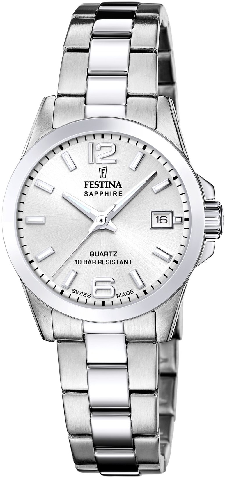 Festina Swiss Made 20049/1 jsou dámské bateriové hodinky v klasickém stylu na ocelovém náramku s překlápěcí sponou. Pouzdro z nerezové oceli má průměr 29,5 milimetru. Přehledný stříbrný číselník s efektem slunečního brusu a ukazatelem data je chráněn odolným safírovým sklíčkem. S vodotěsností 10 ATM jsou hodinky vhodné pro plavání a šnorchlování.