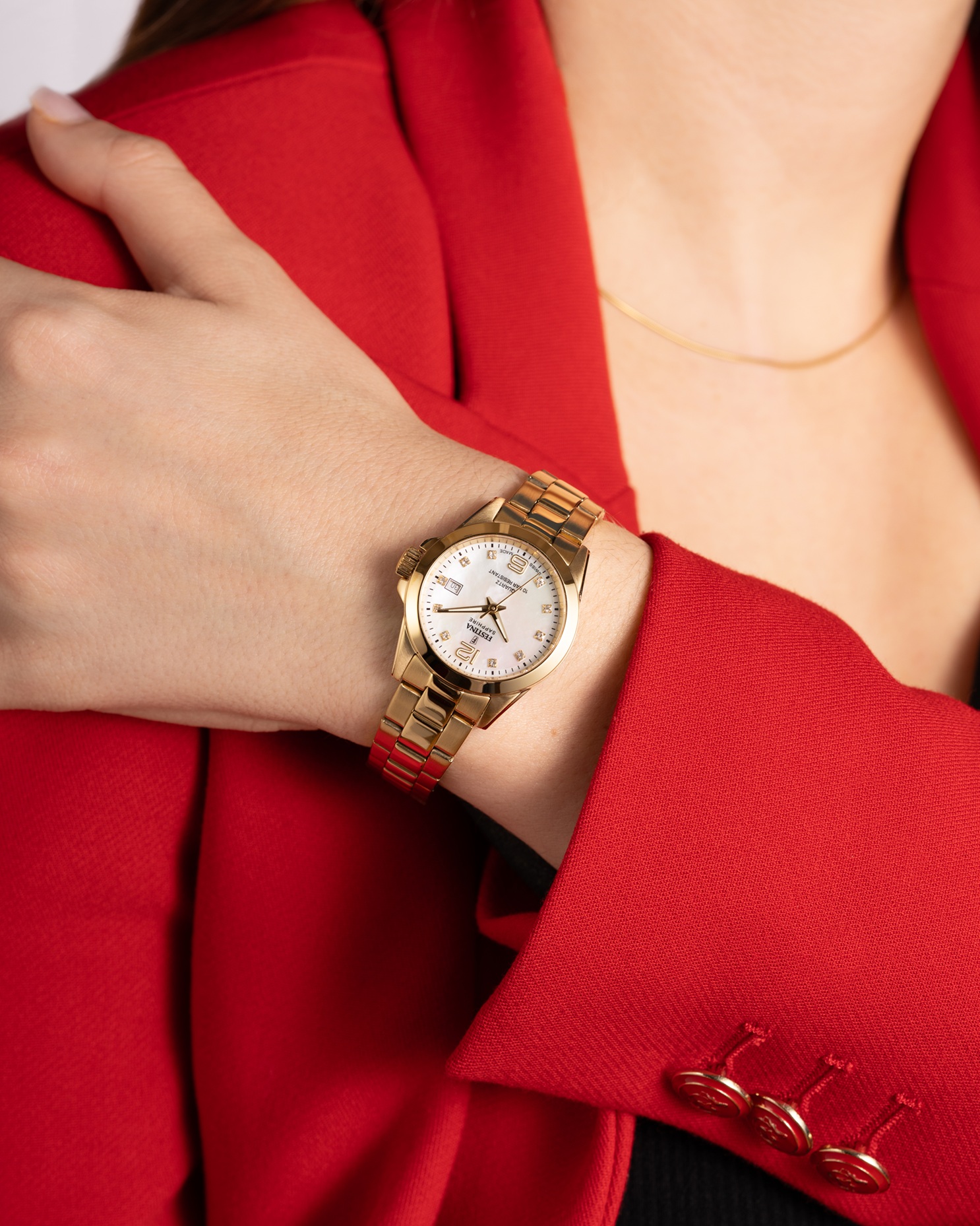 Festina Swiss Made 20050/1 jsou dámské bateriové hodinky v klasickém stylu na ocelovém náramku s povrchovou PVD úpravou zlaté barvy a překlápěcí sponou. Pouzdro z nerezové oceli ve stejné barvě má průměr 29,5 milimetru. Perleťový číselník s 10 zirkony a ukazatelem data je chráněn odolným safírovým sklíčkem a jeho krása vyniká zejména pod přímým světlem, kdy můžeme pozorovat hru barev perleti. S vodotěsností 10 ATM jsou hodinky vhodné pro plavání a šnorchlování.