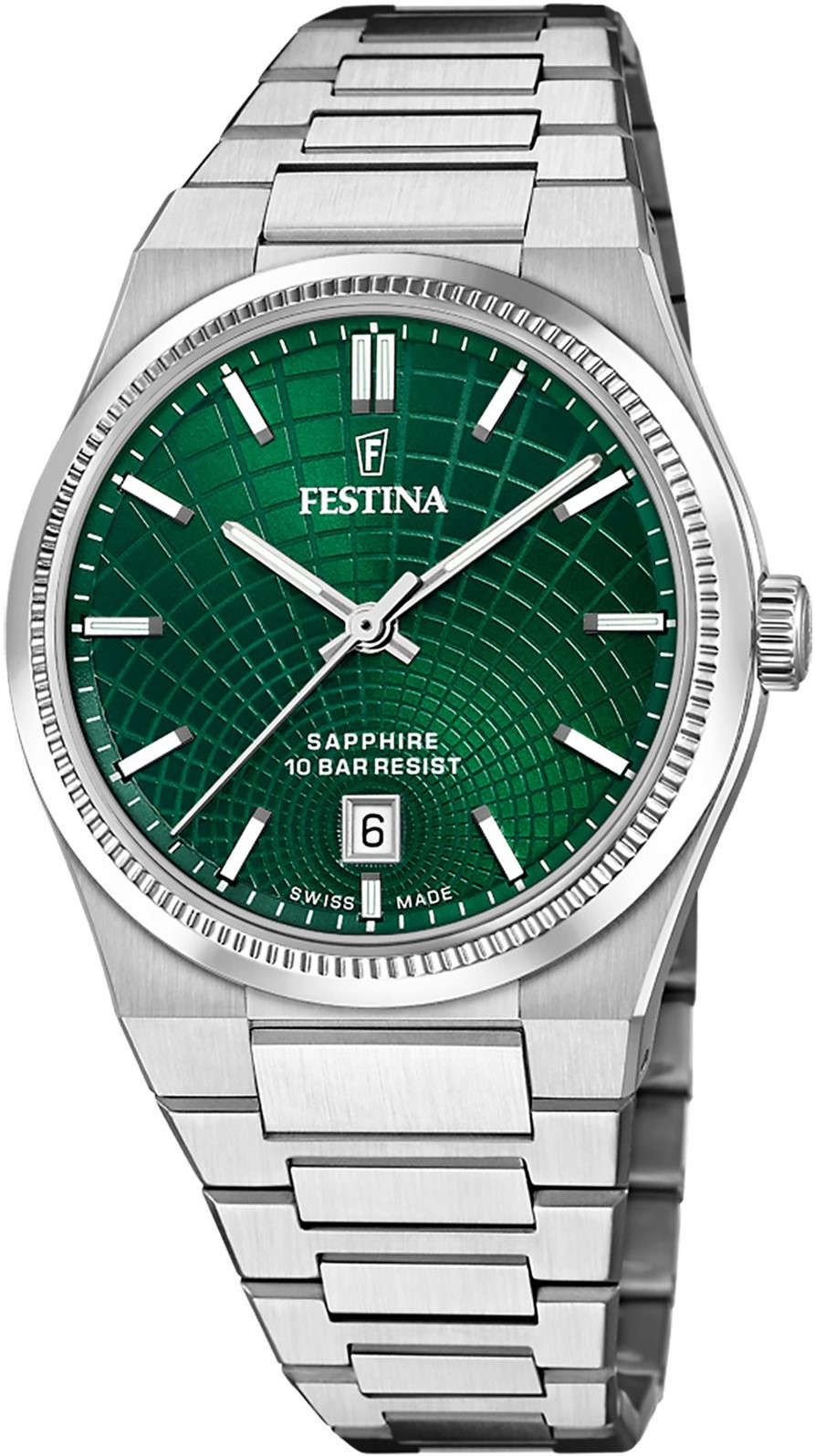 Festina Swiss Made 20051/5 jsou pánské bateriové hodinky v klasickém stylu na ocelovém náramku s motýlkovou sponou. Pouzdro z nerezové oceli má průměr 40 milimetrů. Zelený strukturovaný číselník s ukazatelem data na šesté hodině je chráněn odolným safírovým sklíčkem. Ručičky a některé indexy mají luminiscenční nátěr, který po nasvícení usnadňuje čitelnost za zhoršených světelných podmínek. Chod hodinek zajišťuje quartzový strojek Ronda 715. S vodotěsností 10 ATM jsou hodinky vhodné pro plavání či šnorchlování.