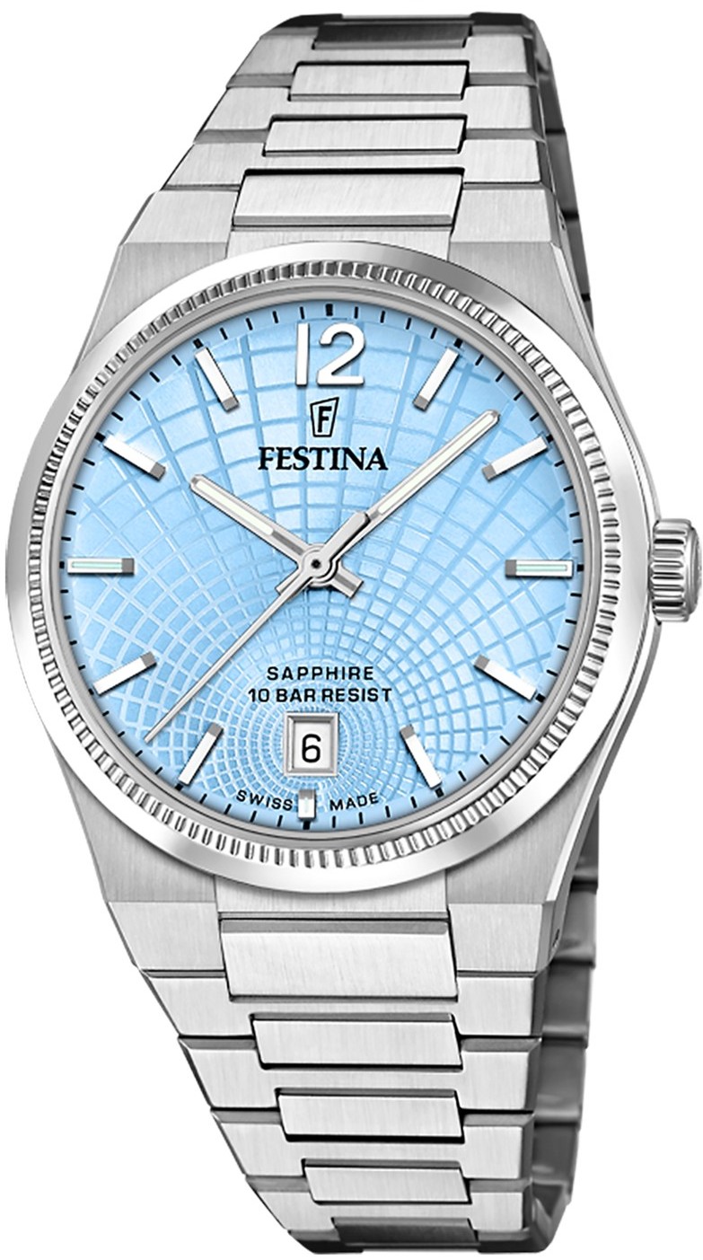 Festina Swiss Made 20052/5 jsou dámské bateriové hodinky v klasickém stylu na ocelovém náramku s motýlkovou sponou. Pouzdro z nerezové oceli má průměr 35 milimetrů. Světle modrý strukturovaný číselník s ukazatelem data na šesté hodině je chráněn odolným safírovým sklíčkem. Ručičky a některé indexy mají luminiscenční nátěr, který po nasvícení usnadňuje čitelnost za zhoršených světelných podmínek. Chod hodinek zajišťuje quartzový strojek Ronda 705. S vodotěsností 10 ATM jsou hodinky vhodné pro plavání či šnorchlování.