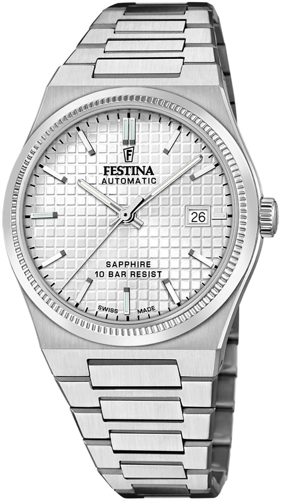 Festina Swiss Made 20028/1 jsou pánské automatické hodinky v klasickém stylu na ocelovém náramku s motýlkovou sponou. Pouzdro z nerezové oceli má průměr 40 milimetrů a průhledné dýnko. Stříbrný číselník s vaflovým vzorem s efektem slunečního brusu a ukazatelem data na třetí hodině je chráněn odolným safírovým sklíčkem. Ručičky a některé indexy mají luminiscenční nátěr, který po nasvícení usnadňuje čitelnost za zhoršených světelných podmínek. Chod hodinek zajišťuje mechanický strojek P024-3h201 s automatickým nátahem a rezervou chodu 38 hodin. S vodotěsností 10 ATM jsou hodinky vhodné pro plavání či šnorchlování.