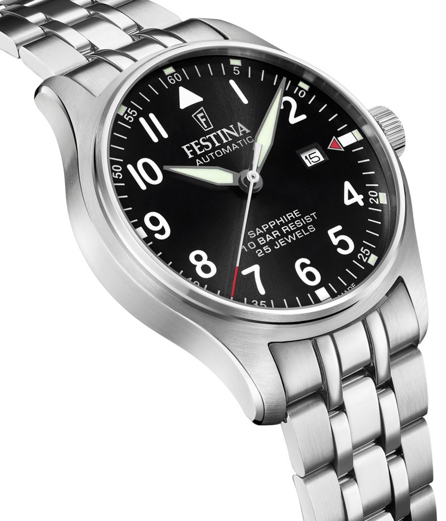 Festina Swiss Made 20151/D jsou pánské automatické hodinky v klasickém stylu na ocelovém náramku s překlápěcí sponou. Pouzdro z nerezové oceli má průměr 43,5 milimetru. Černý číselník s efektem slunečního brusu a ukazatelem data na třetí hodině je chráněn odolným safírovým sklíčkem. Ručičky a indexy mají luminiscenční nátěr, který po nasvícení usnadňuje čitelnost za zhoršených světelných podmínek. Chod hodinek zajišťuje mechanický strojek ETA 2824-2 s automatickým nátahem a rezervou chodu 38 hodin. S vodotěsností 10 ATM jsou hodinky vhodné pro plavání či šnorchlování.