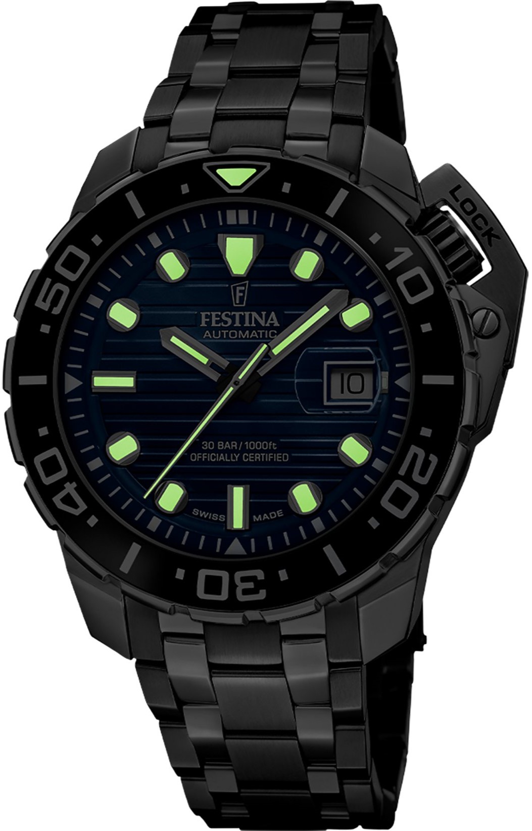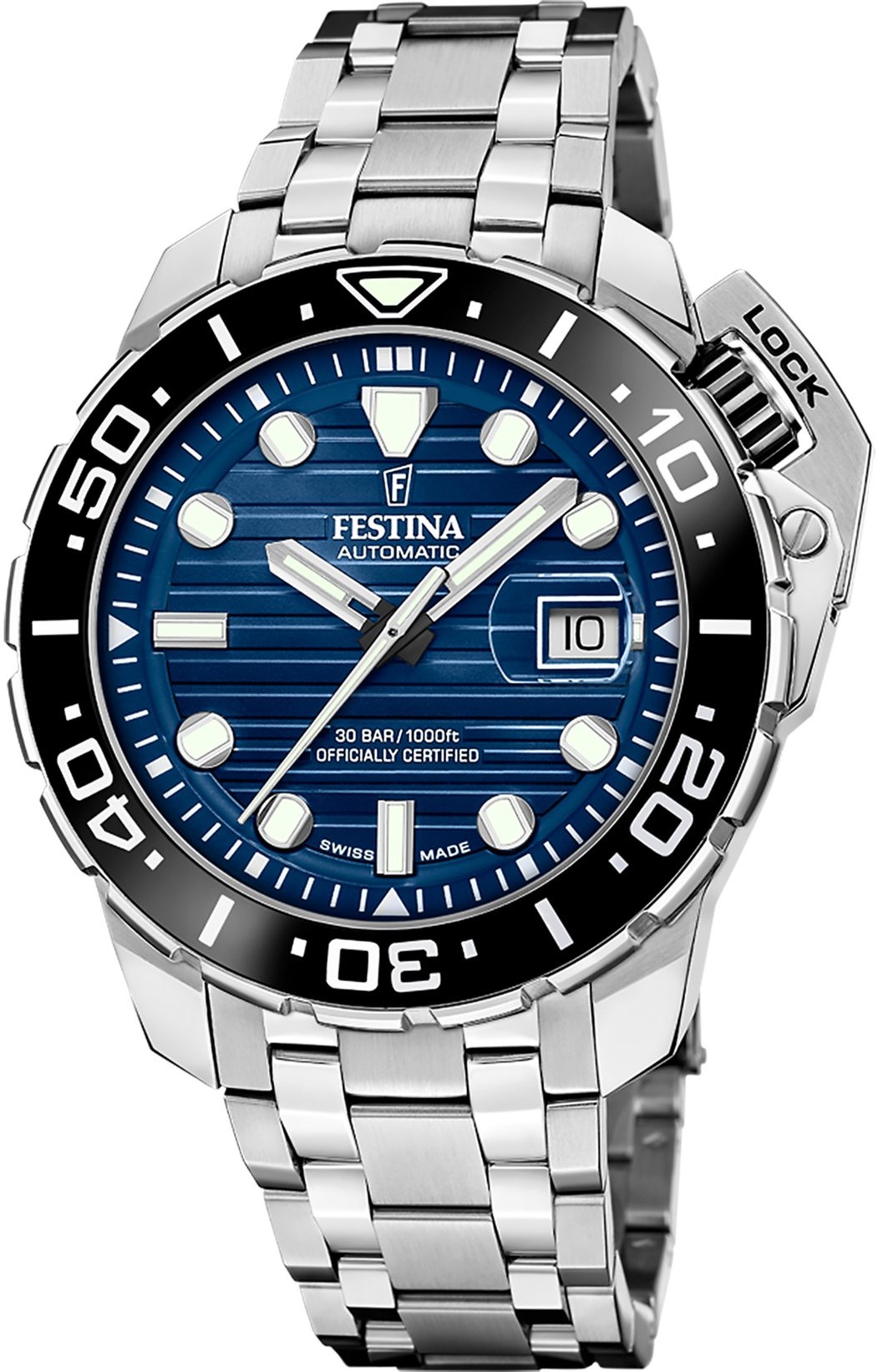 Festina Swiss Made Automatic Diver 20043/2 jsou pánské klasické potápěčské automatické hodinky na ocelovém náramku s překlápěcí sponou. Pouzdro z nerezové oceli má průměr 47,3 milimetru, průhledné dýnko, šroubovací korunku s ochranným mechanismem a jednosměrně otočnou lunetu s černou keramickou vložkou s minutovou stupnicí. Tmavě modrý číselník s horizontální texturou je chráněn safírovým sklíčkem s lupou nad aperturou data. Ručičky a indexy disponují luminiscenčním nátěrem, který po nasvícení usnadňuje čitelnost za zhoršených světelných podmínek. Pohon hodinek zajišťuje mechanický strojek Soprod Newton s automatickým nátahem a rezervou chodu 44 hodin. Hodinky s C.O.S.C. certifikací, která je zárukou vysoké přesnosti nesou označení „Chronometer“. S vodotěsností 30 ATM jsou vhodnou volbou pro hlubinné potápění. Hodinky jsou dodávány ve speciální krabičce, jejíž součástí je náhradní perforovaný silikonový řemínek modré barvy a nástroj na výměnu řemínku.