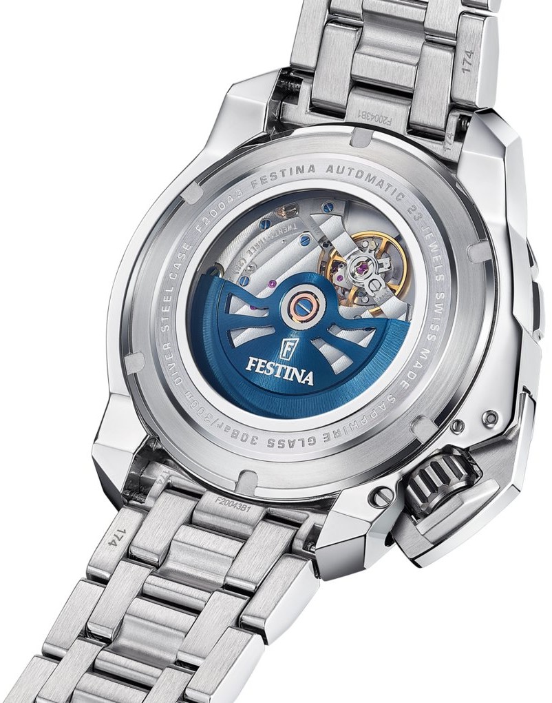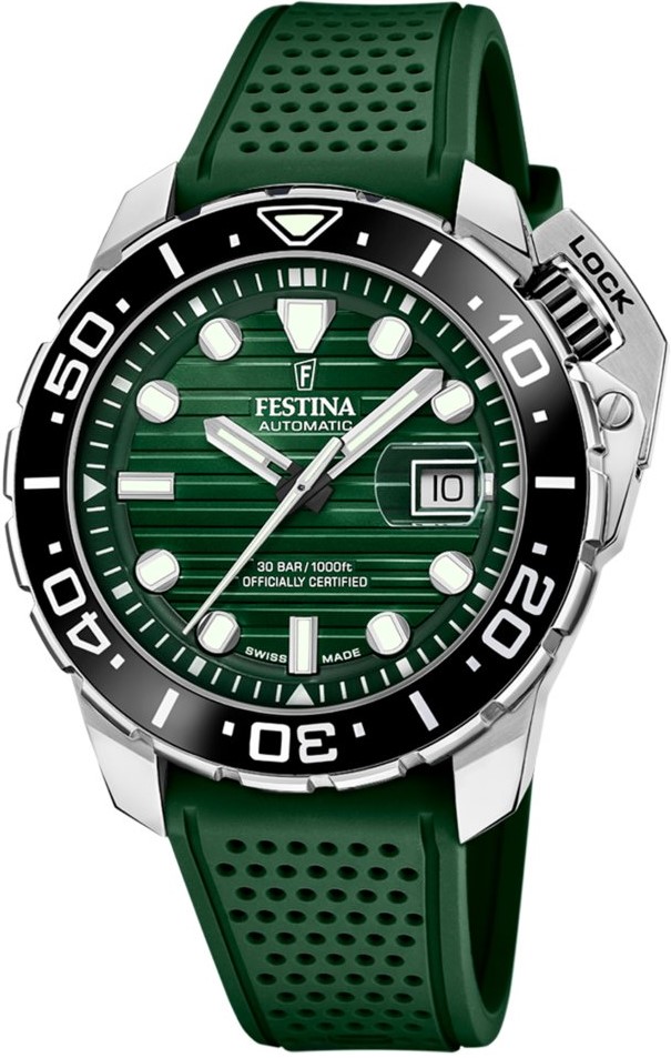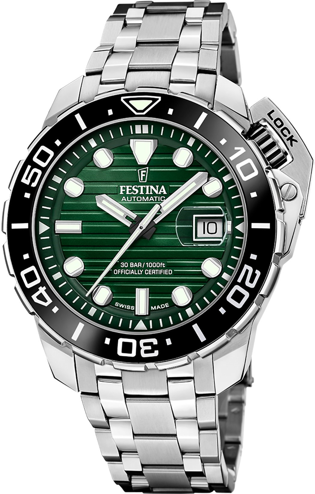 Festina Swiss Made Automatic Diver 20043/4 jsou pánské klasické potápěčské automatické hodinky na ocelovém náramku s překlápěcí sponou. Pouzdro z nerezové oceli má průměr 47,3 milimetru, průhledné dýnko, šroubovací korunku s ochranným mechanismem a jednosměrně otočnou lunetu s černou keramickou vložkou s minutovou stupnicí. Zelený číselník s horizontální texturou je chráněn safírovým sklíčkem s lupou nad aperturou data. Ručičky a indexy disponují luminiscenčním nátěrem, který po nasvícení usnadňuje čitelnost za zhoršených světelných podmínek. Pohon hodinek zajišťuje mechanický strojek Soprod Newton s automatickým nátahem a rezervou chodu 44 hodin. Hodinky s C.O.S.C. certifikací, která je zárukou vysoké přesnosti nesou označení „Chronometer“. S vodotěsností 30 ATM jsou vhodnou volbou pro hlubinné potápění. Hodinky jsou dodávány ve speciální krabičce, jejíž součástí je náhradní perforovaný silikonový řemínek zelené barvy a nástroj na výměnu řemínku.