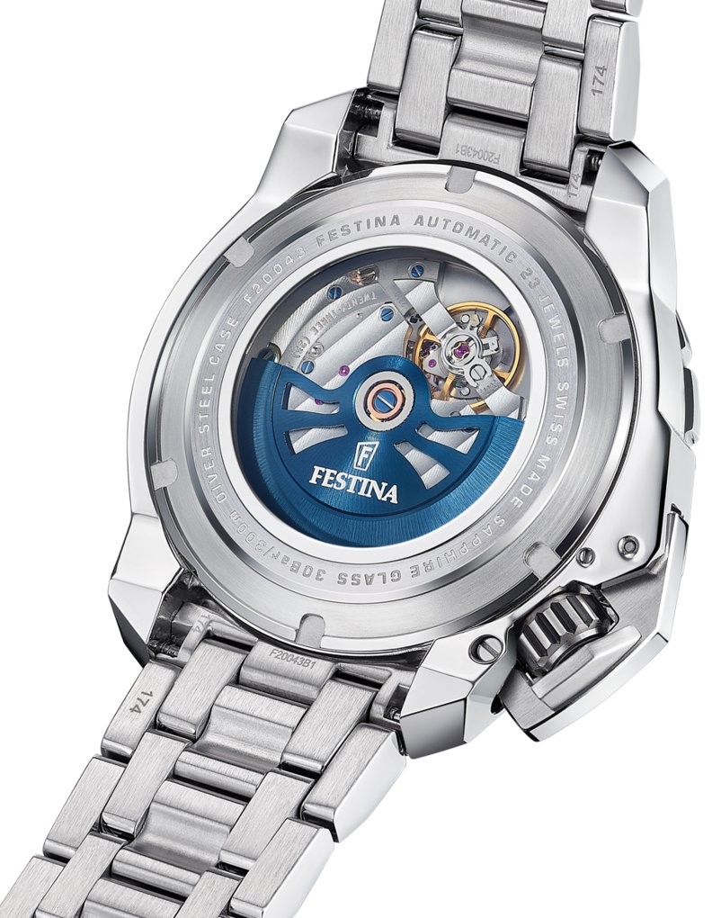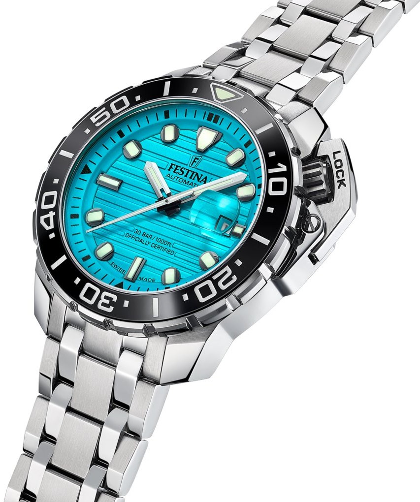 Festina Swiss Made Automatic Diver 20043/5 jsou pánské klasické potápěčské automatické hodinky na ocelovém náramku s překlápěcí sponou. Pouzdro z nerezové oceli má průměr 47,3 milimetru, průhledné dýnko, šroubovací korunku s ochranným mechanismem a jednosměrně otočnou lunetu s černou keramickou vložkou s minutovou stupnicí. Modrý číselník s horizontální texturou je chráněn safírovým sklíčkem s lupou nad aperturou data. Ručičky a indexy disponují luminiscenčním nátěrem, který po nasvícení usnadňuje čitelnost za zhoršených světelných podmínek. Pohon hodinek zajišťuje mechanický strojek Soprod Newton s automatickým nátahem a rezervou chodu 44 hodin. Hodinky s C.O.S.C. certifikací, která je zárukou vysoké přesnosti nesou označení „Chronometer“. S vodotěsností 30 ATM jsou vhodnou volbou pro hlubinné potápění. Hodinky jsou dodávány ve speciální krabičce, jejíž součástí je náhradní perforovaný silikonový řemínek modré barvy a nástroj na výměnu řemínku.
