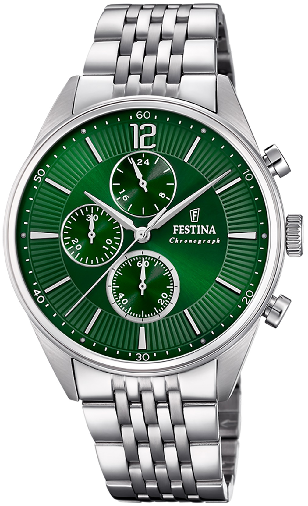 Festina Timeless Chronograph 20285/8 jsou pánské sportovní bateriové hodinky na ocelovém náramku s překlápěcí sponou. Pouzdro z nerezové oceli má průměr 41,5 milimetru. Zelený strukturovaný číselník se stopkami a ukazatelem času ve 24hodinovém formátu je chráněn minerálním sklíčkem. Hodinky pohání quartzový strojek Miyota JS10 s přesností ±20 sekund za měsíc. S vodotěsností 5 ATM jsou hodinky odolné proti dešti a při sprchování.