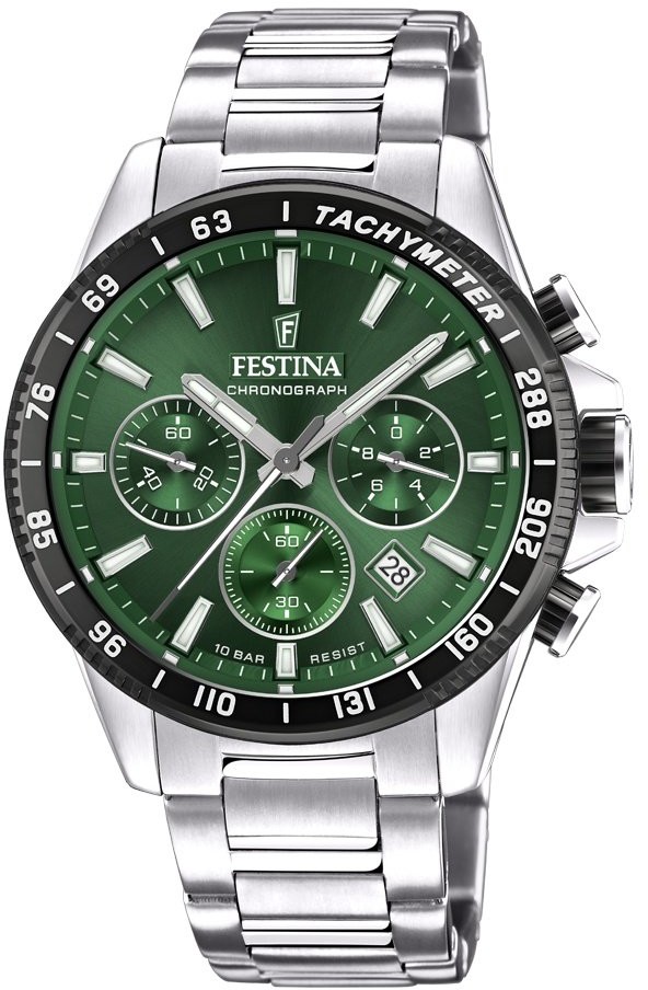 Festina Timeless Chronograph 20560/4 jsou pánské sportovní bateriové hodinky na ocelovém náramku s překlápěcí sponou. Pouzdro z nerezové oceli má průměr 45 milimetrů a černou lunetu s tachymetrickou stupnicí. Zelený číselník s efektem slunečního brusu, ukazatelem data a stopkami je chráněn minerálním sklíčkem. Ručičky a indexy disponují luminiscenčním nátěrem, který po nasvícení usnadňuje čitelnost za zhoršených světelných podmínek. Hodinky pohání quartzový strojek Miyota 6S20 s přesností ±20 sekund za měsíc. S vodotěsností 10 ATM jsou hodinky vhodné pro plavání či šnorchlování.