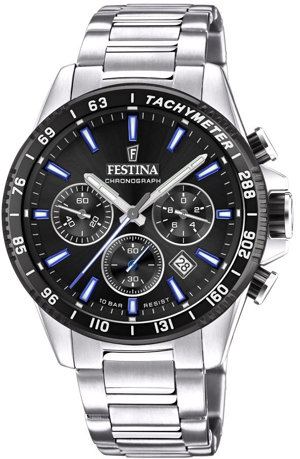 Festina Timeless Chronograph 20560/5 jsou pánské sportovní bateriové hodinky na ocelovém náramku s překlápěcí sponou. Pouzdro z nerezové oceli má průměr 45 milimetrů a černou lunetu s tachymetrickou stupnicí. Černý číselník s ukazatelem data a stopkami je chráněn minerálním sklíčkem. Ručičky a indexy disponují luminiscenčním nátěrem, který po nasvícení usnadňuje čitelnost za zhoršených světelných podmínek. Hodinky pohání quartzový strojek Miyota 6S20 s přesností ±20 sekund za měsíc. S vodotěsností 10 ATM jsou hodinky vhodné pro plavání či šnorchlování.