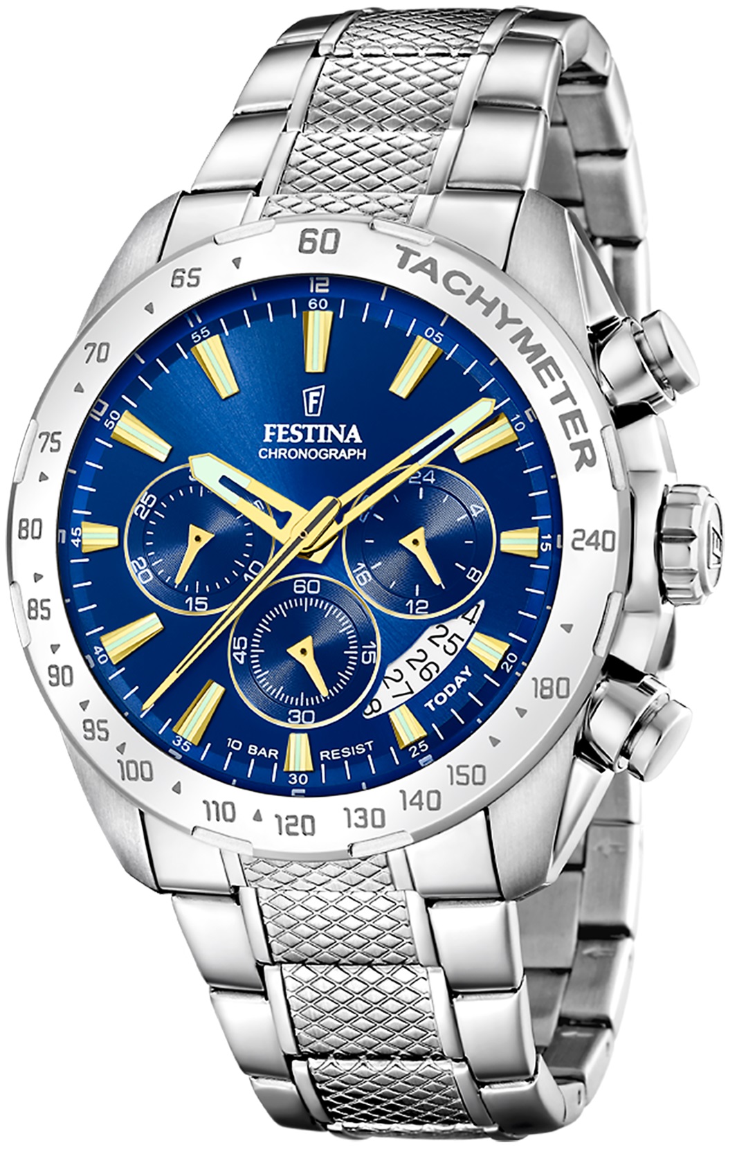 Festina Timeless Chronograph 20668/2 jsou pánské sportovní bateriové hodinky na ocelovém náramku s překlápěcí sponou. Pouzdro z nerezové oceli má průměr 44,5 milimetru a lunetu s tachymetrickou stupnicí. Modrý číselník s datumovkou, stopkami a ukazatelem času ve 24hodinovém formátu je chráněn minerálním sklíčkem. Ručičky a indexy disponují luminiscenčním nátěrem, který po nasvícení usnadňuje čitelnost za zhoršených světelných podmínek. Hodinky pohání quartzový strojek Miyota JS25 s přesností ±20 sekund za měsíc. S vodotěsností 10 ATM jsou hodinky vhodné pro plavání či šnorchlování.