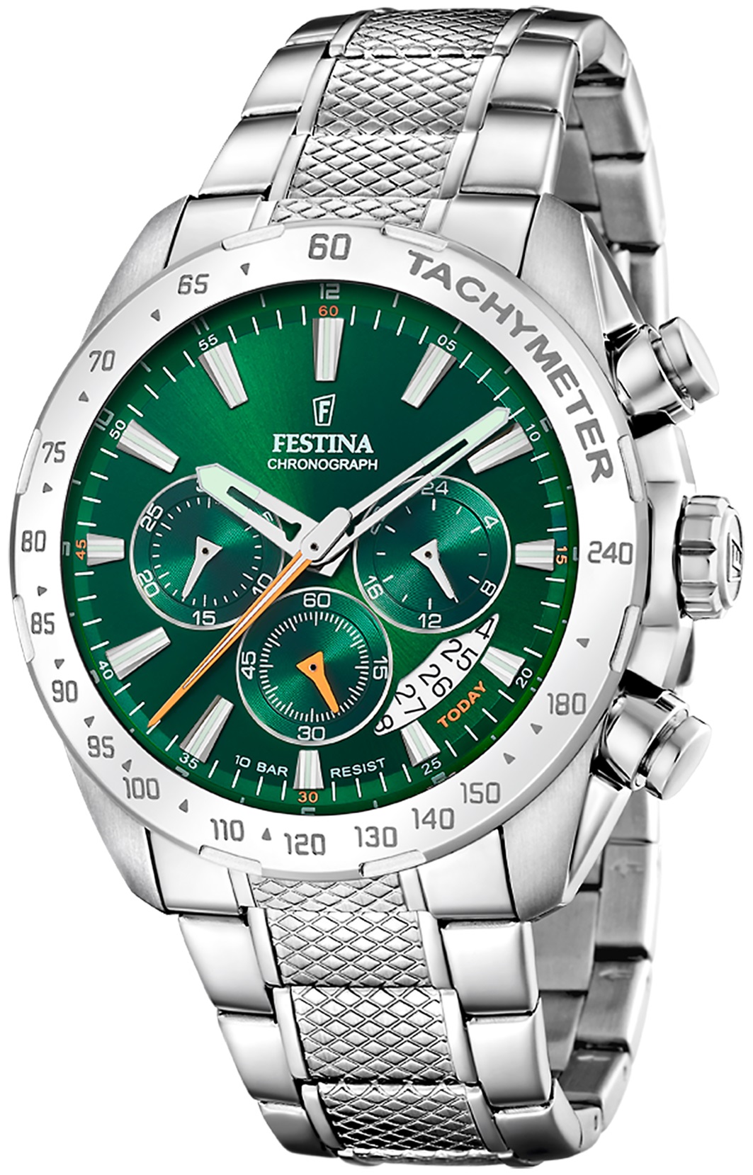Festina Timeless Chronograph 20668/3 jsou pánské sportovní bateriové hodinky na ocelovém náramku s překlápěcí sponou. Pouzdro z nerezové oceli má průměr 44,5 milimetru a lunetu s tachymetrickou stupnicí. Zelený číselník s datumovkou, stopkami a ukazatelem času ve 24hodinovém formátu je chráněn minerálním sklíčkem. Ručičky a indexy disponují luminiscenčním nátěrem, který po nasvícení usnadňuje čitelnost za zhoršených světelných podmínek. Hodinky pohání quartzový strojek Miyota JS25 s přesností ±20 sekund za měsíc. S vodotěsností 10 ATM jsou hodinky vhodné pro plavání či šnorchlování.