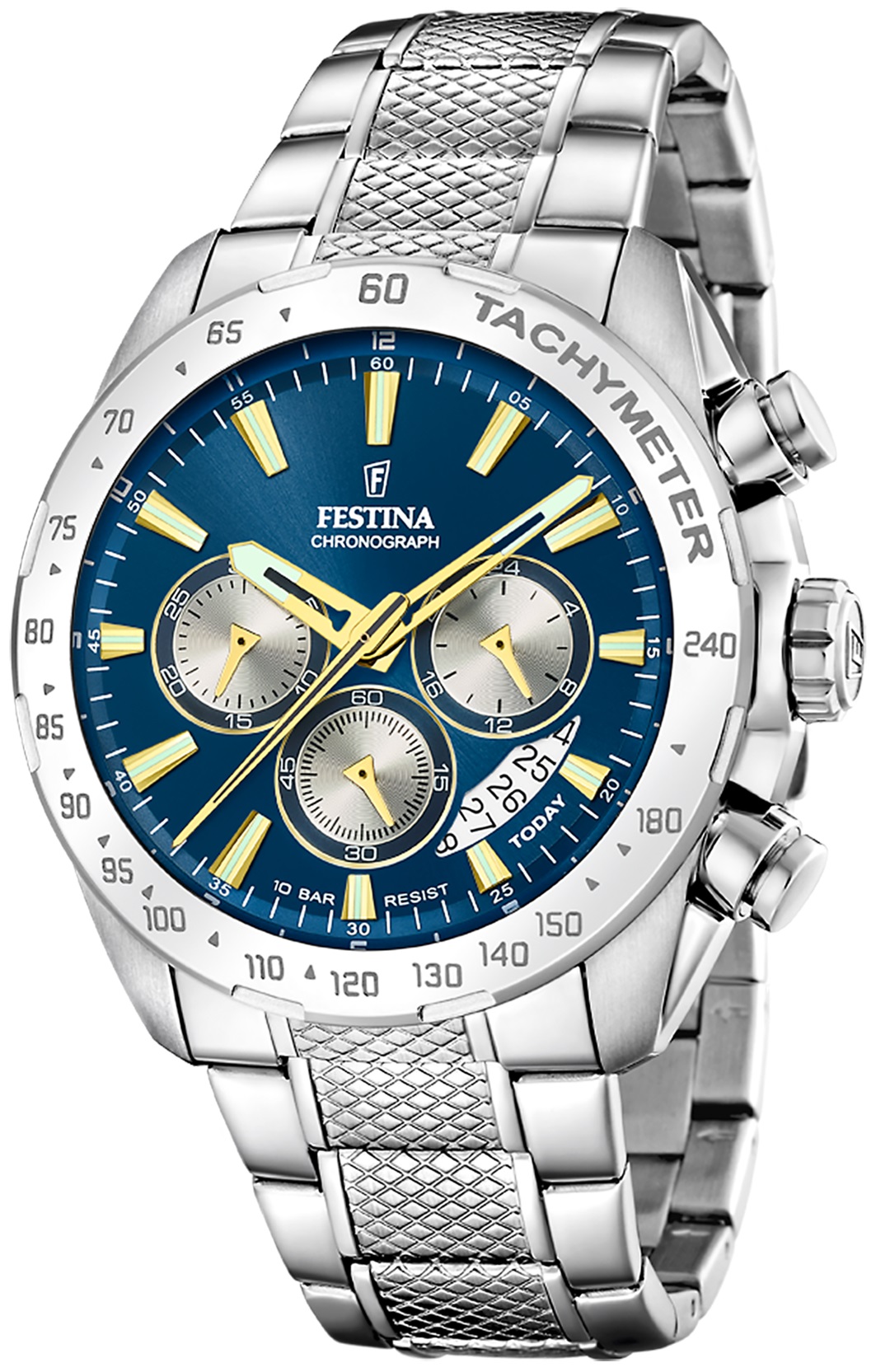 Festina Timeless Chronograph 20668/5 jsou pánské sportovní bateriové hodinky na ocelovém náramku s překlápěcí sponou. Pouzdro z nerezové oceli má průměr 44,5 milimetru a lunetu s tachymetrickou stupnicí. Modro-stříbrný číselník s datumovkou, stopkami a ukazatelem času ve 24hodinovém formátu je chráněn minerálním sklíčkem. Ručičky a indexy disponují luminiscenčním nátěrem, který po nasvícení usnadňuje čitelnost za zhoršených světelných podmínek. Hodinky pohání quartzový strojek Miyota JS25 s přesností ±20 sekund za měsíc. S vodotěsností 10 ATM jsou hodinky vhodné pro plavání či šnorchlování.