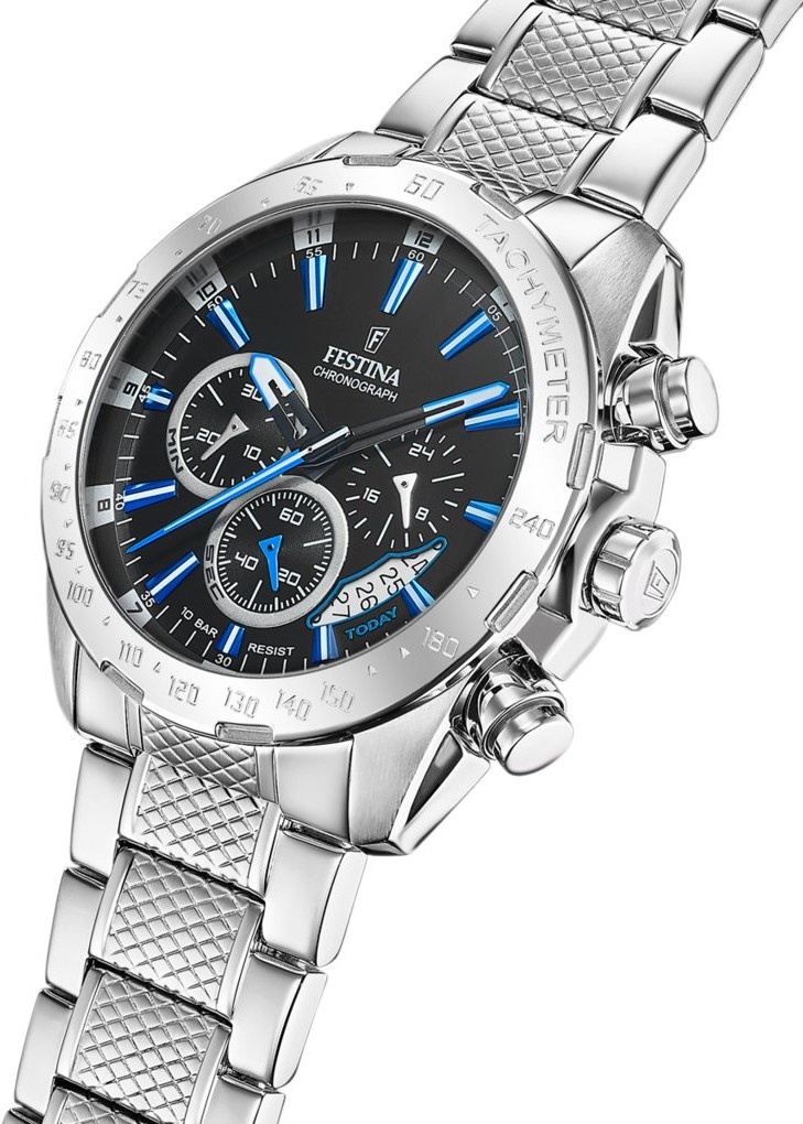 Festina Timeless Chronograph 20668/6 jsou pánské sportovní bateriové hodinky na ocelovém náramku s překlápěcí sponou. Pouzdro z nerezové oceli má průměr 44,5 milimetru a lunetu s tachymetrickou stupnicí. Černý číselník s datumovkou, stopkami a ukazatelem času ve 24hodinovém formátu je chráněn minerálním sklíčkem. Ručičky a indexy disponují luminiscenčním nátěrem, který po nasvícení usnadňuje čitelnost za zhoršených světelných podmínek. Hodinky pohání quartzový strojek Miyota JS25 s přesností ±20 sekund za měsíc. S vodotěsností 10 ATM jsou hodinky vhodné pro plavání či šnorchlování.