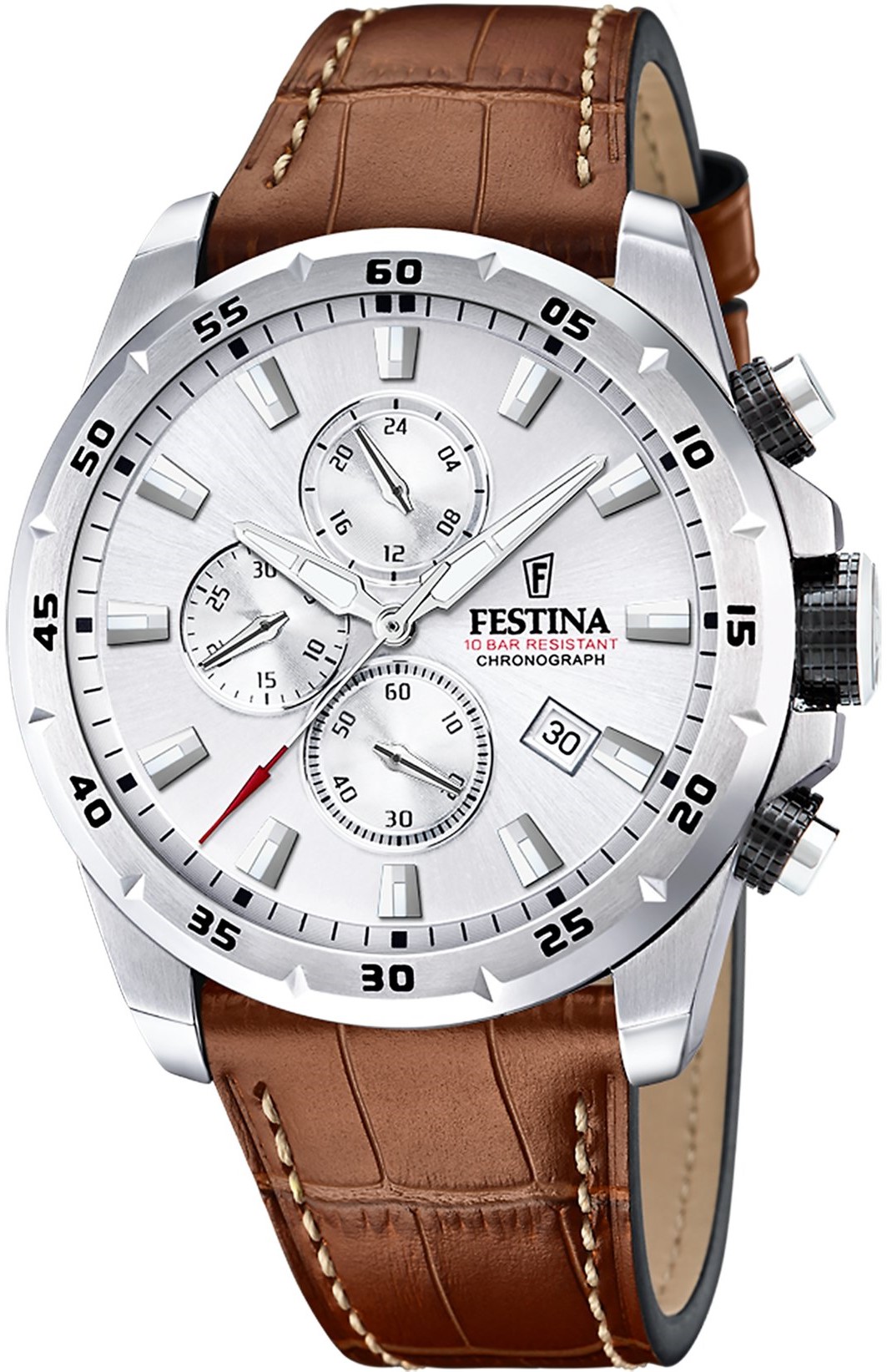 Festina Timeless Chronograph 20692/1 jsou pánské sportovně elegantní bateriové hodinky na hnědém koženém řemínku s kontrastním prošíváním a trnovou sponou. Pouzdro z nerezové oceli má průměr 45,05 milimetru a lunetu s minutovou stupnicí. Stříbrný číselník s datumovkou, stopkami a ukazatelem času ve 24hodinovém formátu je chráněn minerálním sklíčkem. Ručičky a indexy disponují luminiscenčním nátěrem, který po nasvícení usnadňuje čitelnost za zhoršených světelných podmínek. Hodinky pohání quartzový strojek Miyota JS15 s přesností ±20 sekund za měsíc. S vodotěsností 10 ATM jsou hodinky vhodné pro plavání či šnorchlování.