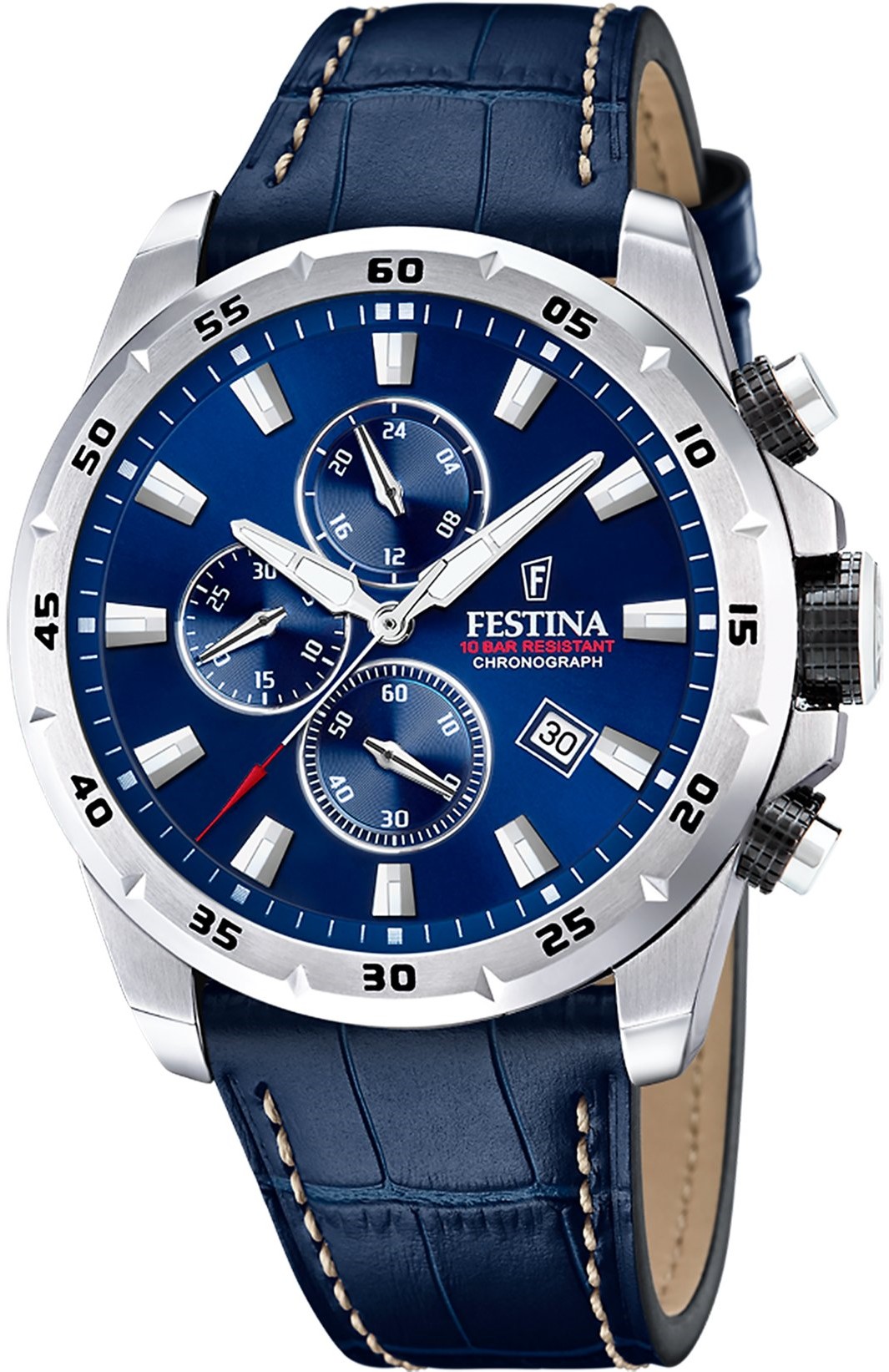 Festina Timeless Chronograph 20692/2 jsou pánské sportovně elegantní bateriové hodinky na modrém koženém řemínku s kontrastním prošíváním a trnovou sponou. Pouzdro z nerezové oceli má průměr 45,05 milimetru a lunetu s minutovou stupnicí. Modrý číselník s efektem slunečního brusu, datumovkou, stopkami a ukazatelem času ve 24hodinovém formátu je chráněn minerálním sklíčkem. Ručičky a indexy disponují luminiscenčním nátěrem, který po nasvícení usnadňuje čitelnost za zhoršených světelných podmínek. Hodinky pohání quartzový strojek Miyota JS15 s přesností ±20 sekund za měsíc. S vodotěsností 10 ATM jsou hodinky vhodné pro plavání či šnorchlování.