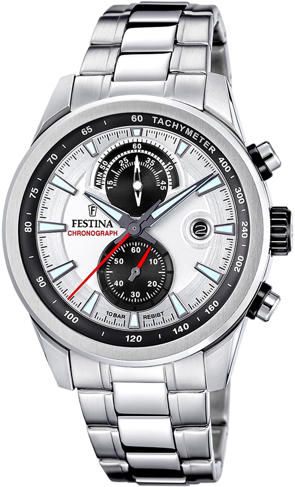 Festina Timeless Chronograph 20694/1 jsou pánské sportovní bateriové hodinky na ocelovém náramku s překlápěcí sponou. Pouzdro z nerezové oceli má průměr 44 milimetrů a černou vnitřní lunetu s tachymetrickou stupnicí. Stříbrno-černý číselník s ukazatelem data a stopkami je chráněn odolným minerálním sklíčkem. Ručičky a indexy disponují luminiscenčním nátěrem, který po nasvícení usnadňuje čitelnost za zhoršených světelných podmínek. Hodinky pohání quartzový strojek Miyota 0S11 s přesností ±20 sekund za měsíc. S vodotěsností 10 ATM jsou hodinky vhodné pro plavání či šnorchlování.