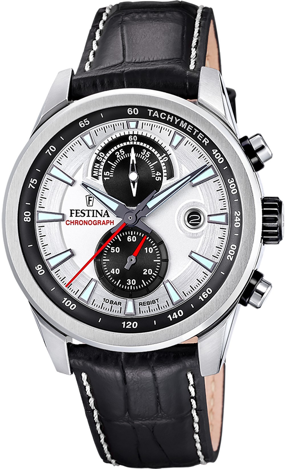 Festina Timeless Chronograph 20695/1 jsou pánské sportovní bateriové hodinky na černém koženém řemínku s kontrastním prošíváním a trnovou sponou. Pouzdro z nerezové oceli má průměr 44 milimetrů a černou vnitřní lunetu s tachymetrickou stupnicí. Stříbrno-černý číselník s ukazatelem data a stopkami je chráněn odolným minerálním sklíčkem. Ručičky a indexy disponují luminiscenčním nátěrem, který po nasvícení usnadňuje čitelnost za zhoršených světelných podmínek. Hodinky pohání quartzový strojek Miyota 0S11 s přesností ±20 sekund za měsíc. S vodotěsností 10 ATM jsou hodinky vhodné pro plavání či šnorchlování.