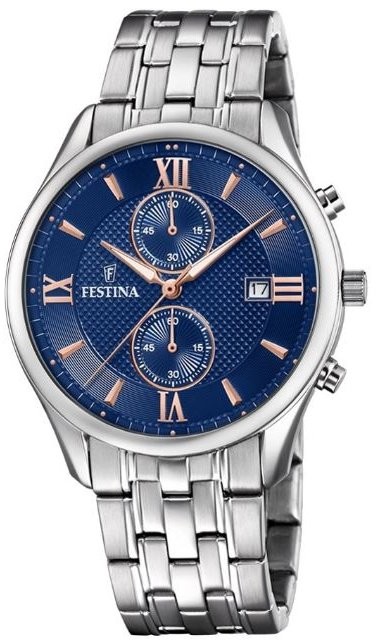 Festina Timeless Chronograph 6854/6 jsou pánské klasické bateriové hodinky na ocelovém náramku s překlápěcí sponou. Pouzdro z nerezové oceli má průměr 42 milimetrů. Modrý strukturovaný číselník s datumovkou a stopkami je chráněn minerálním sklíčkem. Ručičky disponují luminiscenčním nátěrem, který po nasvícení usnadňuje čitelnost za zhoršených světelných podmínek. Hodinky pohání quartzový strojek Miyota 0S11 s přesností ±20 sekund za měsíc. S vodotěsností 3 ATM jsou hodinky odolné proti dešti a při mytí rukou.