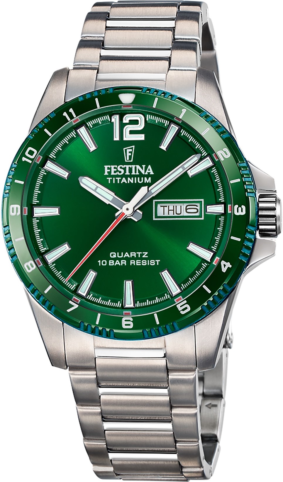 Festina Titanium 20698/3 jsou pánské klasické bateriové hodinky na titanovém náramku s překlápěcí sponou. Pouzdro z titanu má průměr 43 milimetrů. Zelený číselník s efektem slunečního brusu a ukazatelem data a dne v týdnu je chráněn odolným minerálním sklíčkem. Ručky a indexy disponují luminiscenčním nátěrem, který po nasvícení usnadňuje čitelnost za zhoršených světelných podmínek. Hodinky pohání quartzový strojek Miyota GR02. S vodotěsností 10 ATM jsou hodinky vhodné pro plavání či šnorchlování.