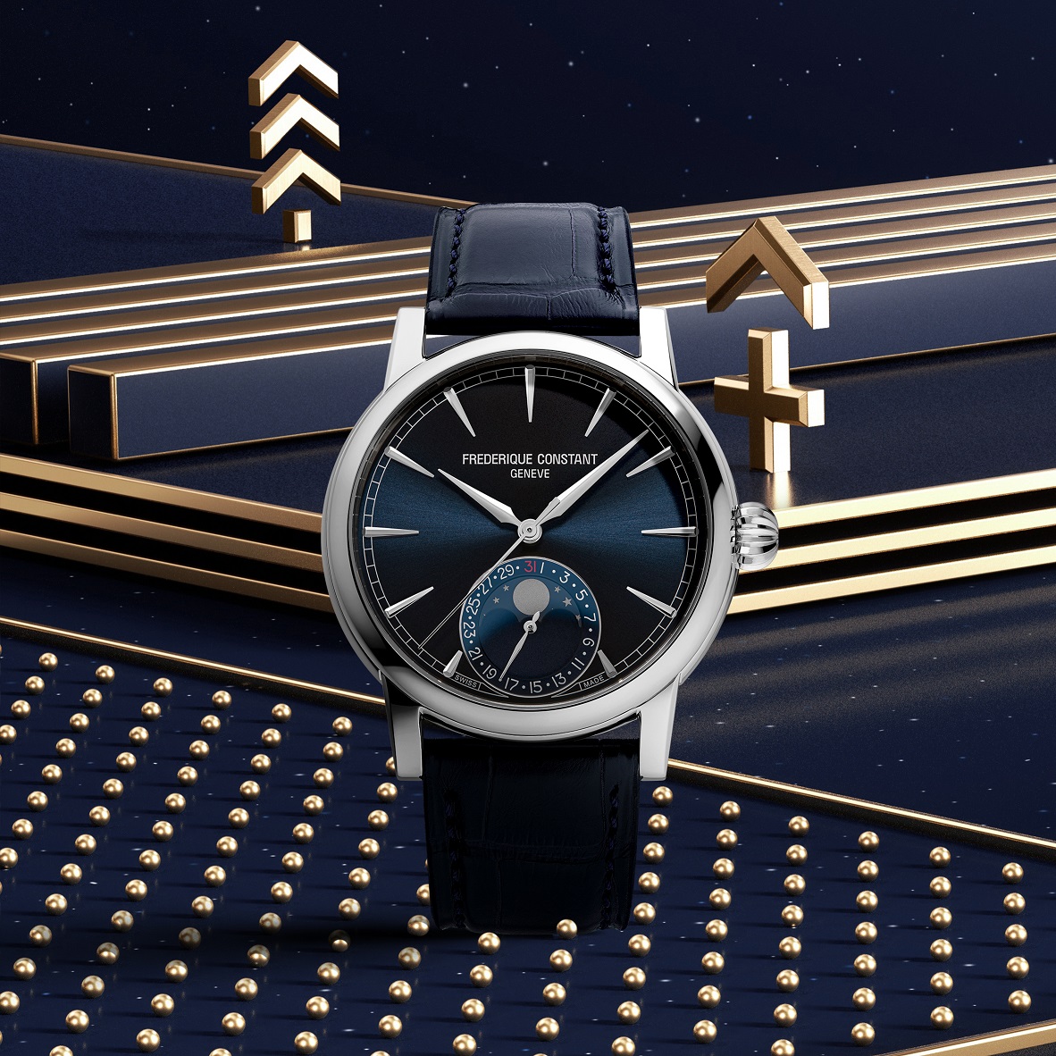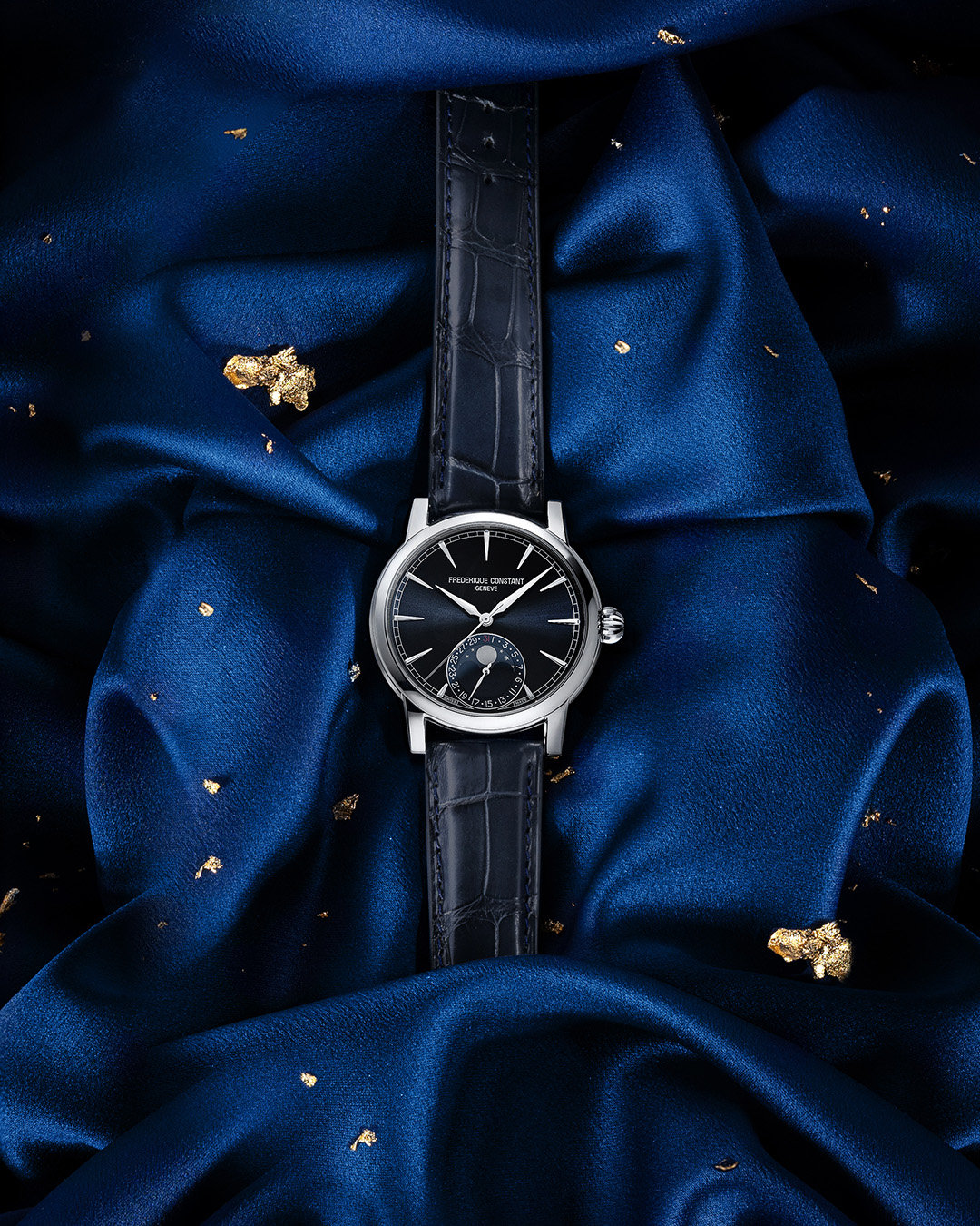 Frederique Constant Classic Date Manufacture FC-716N3H6 jsou pánské automatické hodinky na modrém řemínku z aligátoří kůže s překlápěcí sponou. Pouzdro z nerezové oceli má průměr 40 milimetrů, průhledné dýnko a zdobenou korunku. Tyto elegantní hodinky jsou vhodnou volbou pro každodenní nošení. Modrý číselník s efektem slunečního brusu, indikací data a ukazatelem měsíční fáze na šesté hodině je chráněn odolným safírovým sklem s antireflexní vrstvou. Pohon hodinek zajišťuje manufakturní strojek FC-716 s automatickým nátahem a rezervou chodu přibližně 72 hodin. Tento strojek s funkcí hackingu lze v případě potřeby natahovat i ručně pomocí korunky. Vodotěsnost hodinek činí 5 ATM a jsou tedy odolné proti dešti a při sprchování.