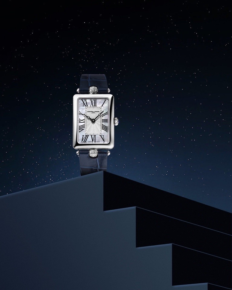 Frederique Constant Classics Art Deco Carrée FC-200MPW2AC2D6 jsou dámské bateriové hodinky na modrém koženém řemínku s trnovou sponou. Hranaté pouzdro z nerezové oceli osazené 18 diamanty o hmotnosti 0,11 ct má průměr 20,7 milimetru a korunku zdobenou modrým kabošonem. Tyto elegantní hodinky jsou vhodnou volbou pro každodenní nošení. Číselník se stříbrným středem zdobeným giloší s kontrastními brequet ručkami je chráněn odolným safírovým sklem. Černé hodinové indexy ve tvaru římských číslic jsou podtrženy perleťovým obvodem číselníku, jehož krása vyniká zejména pod přímým světlem, kdy můžeme pozorovat hru barev perleti. Pohon hodinek zajišťuje spolehlivý quartzový strojek FC-200 (základem je strojek Ronda 1062). S vodotěsností 3 ATM jsou hodinky odolné proti vlhkosti a dešti.