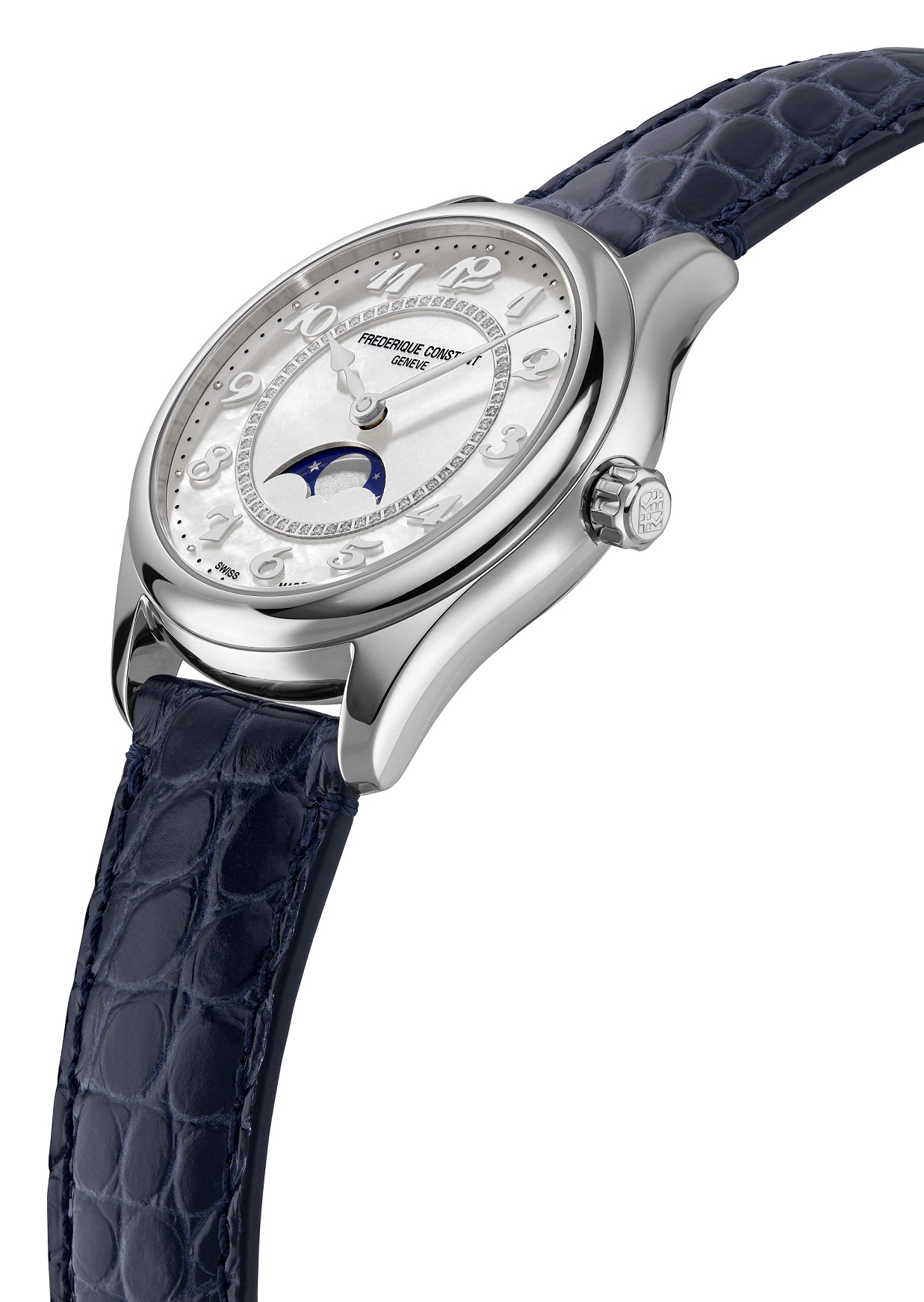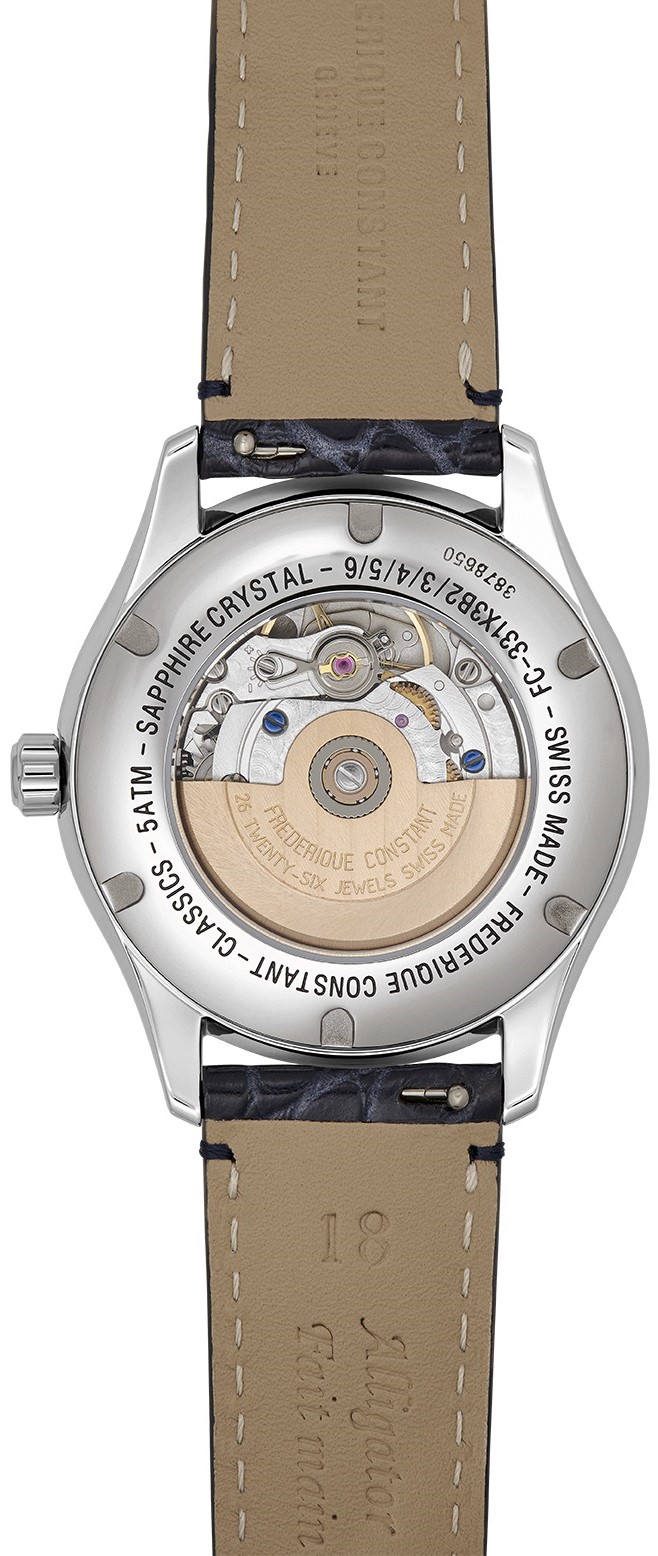 Frederique Constant Classics Elegance FC-331MPWD3B6 jsou dámské automatické hodinky na modrém řemínku z aligátoří kůže s překlápěcí sponou. Pouzdro z nerezové oceli má průměr 36 milimetrů, průhledné dýnko a signovanou korunku. Tyto elegantní hodinky jsou vhodnou volbou pro každodenní nošení. Perleťový číselník s ukazatelem měsíční fáze a 56 diamanty o hmotnosti 0,7 ct je chráněn odolným safírovým sklem a jeho krása vyniká zejména pod přímým světlem, kdy můžeme pozorovat hru barev perleti. Aplikované hodinové indexy doplňují elegantní listové ručky. Pohon hodinek zajišťuje mechanický strojek FC-331 s automatickým nátahem a rezervou chodu přibližně 38 hodin. Základem kalibru je Sellita SW280. Tento strojek s funkcí hackingu lze v případě potřeby natahovat i ručně pomocí korunky. S vodotěsností 5 ATM jsou hodinky odolné proti dešti a při sprchování.