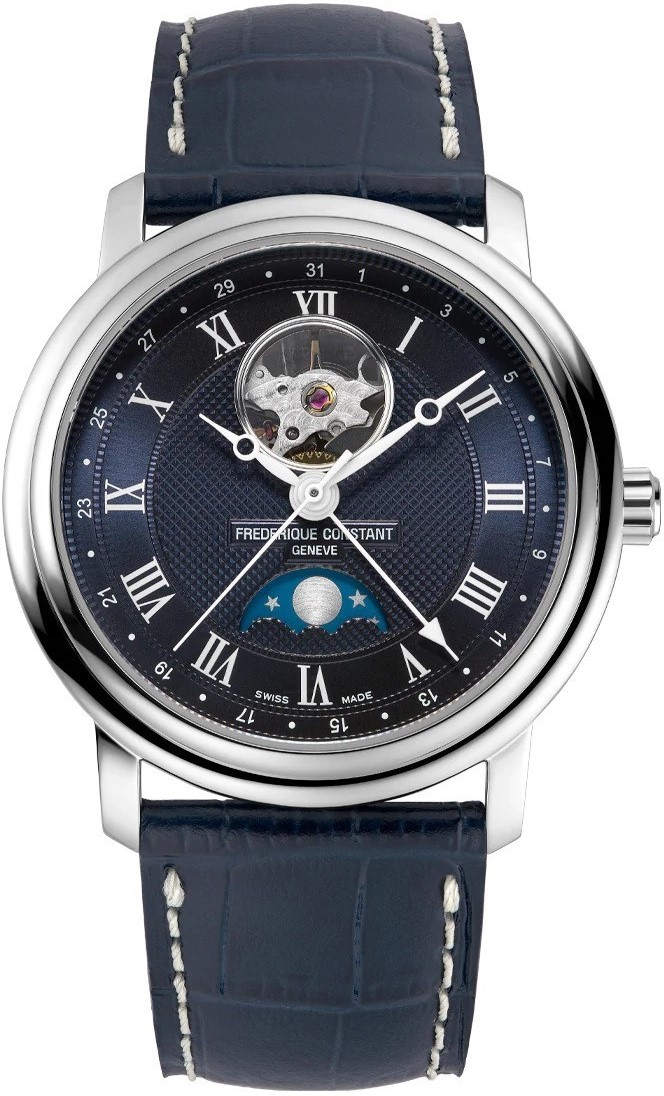 Frederique Constant Classics Heart Beat Moonphase FC-335MCNW4P26 jsou pánské automatické hodinky na modrém koženém řemínku s bílým prošíváním a trnovou sponou. Pouzdro z nerezové oceli má průměr 40 milimetrů, průhledné dýnko a signovanou korunku. Tyto elegantní hodinky jsou vhodnou volbou pro každodenní nošení. Modrý číselník s průhledem na samotné srdce strojku (setrvačku), středem zdobeným giloší s texturou „clous de Paris” a ukazatelem měsíční fáze je chráněn odolným safírovým sklem. Číselník dále disponuje ukazatelem data po jeho obvodu formou centrální ručky. Bílé hodinové indexy ve tvaru římských číslic doplňují breguet ručky v identické barvě. Pohon hodinek zajišťuje mechanický strojek FC-335 s automatickým nátahem a rezervou chodu přibližně 38 hodin. Základem tohoto kalibru je Sellita SW200. Tento strojek s funkcí hackingu lze v případě potřeby natahovat i ručně pomocí korunky. S vodotěsností 6 ATM jsou hodinky odolné proti dešti a při sprchování.