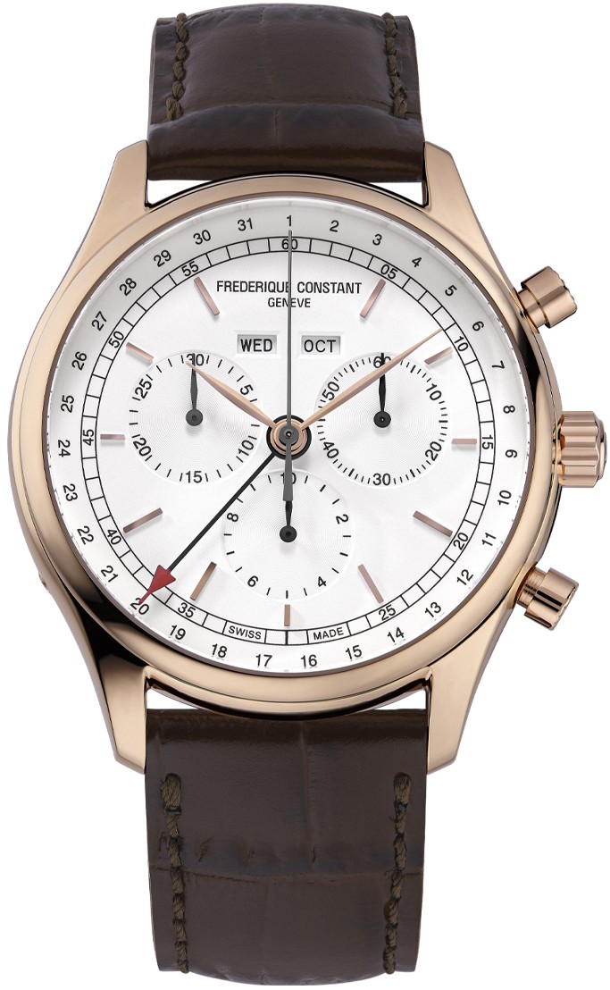 Frederique Constant Classics Quartz Chronograph Triple Calendar FC-296SW5B4 jsou pánské bateriové hodinky na hnědém koženém řemínku s trnovou sponou. Pouzdro z nerezové oceli s PVD úpravou v barvě růžového zlata má průměr 40 milimetrů a signovanou korunku. Tyto sportovně elegantní hodinky jsou vhodnou volbou pro každodenní nošení. Bílý číselník s indikací dne v týdnu a měsíce na dvanácté hodině je chráněn odolným safírovým sklem. Dále číselník disponuje subciferníky chronografu a ukazatelem data po jeho obvodu formou ručky s výraznou červenou koncovkou. Pohon hodinek zajišťuje spolehlivý quartzový strojek FC-296 (základem je strojek Ronda 5040.F). S vodotěsností 5 ATM jsou hodinky odolné proti dešti a při sprchování.
