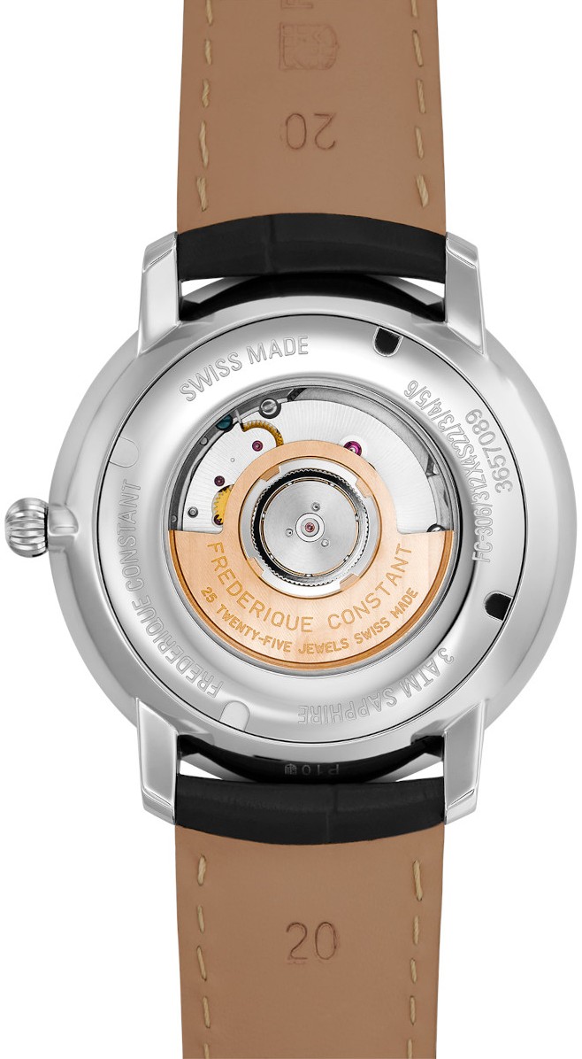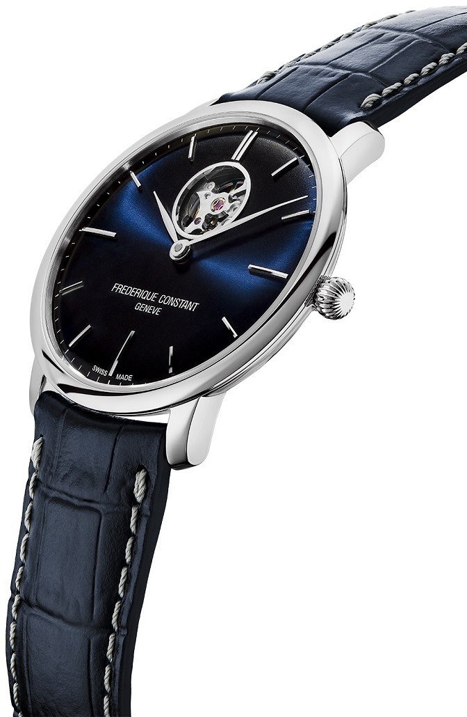 Frederique Constant Slimline Heart Beat FC-312N4S6 jsou pánské automatické hodinky na modrém koženém řemínku s kontrastním prošíváním a překlápěcí sponou. Pouzdro z nerezové oceli má průměr 40 milimetrů, tloušťku pohodlných 8,3 milimetru, průhledné dýnko a zdobenou korunku. Tmavě modrý číselník s efektem slunečního brusu a průhledem na samotné srdce strojku (setrvačku) je chráněn odolným safírovým sklem. Aplikované hodinové indexy doplňují elegantní listové ručky. Pohon hodinek zajišťuje mechanický strojek FC-312 s automatickým nátahem a rezervou chodu přibližně 42 hodin. Základem kalibru je Sellita SW300. Tento strojek s funkcí hackingu lze v případě potřeby natahovat i ručně pomocí korunky. S vodotěsností 3 ATM jsou hodinky odolné proti vlhkosti a dešti.