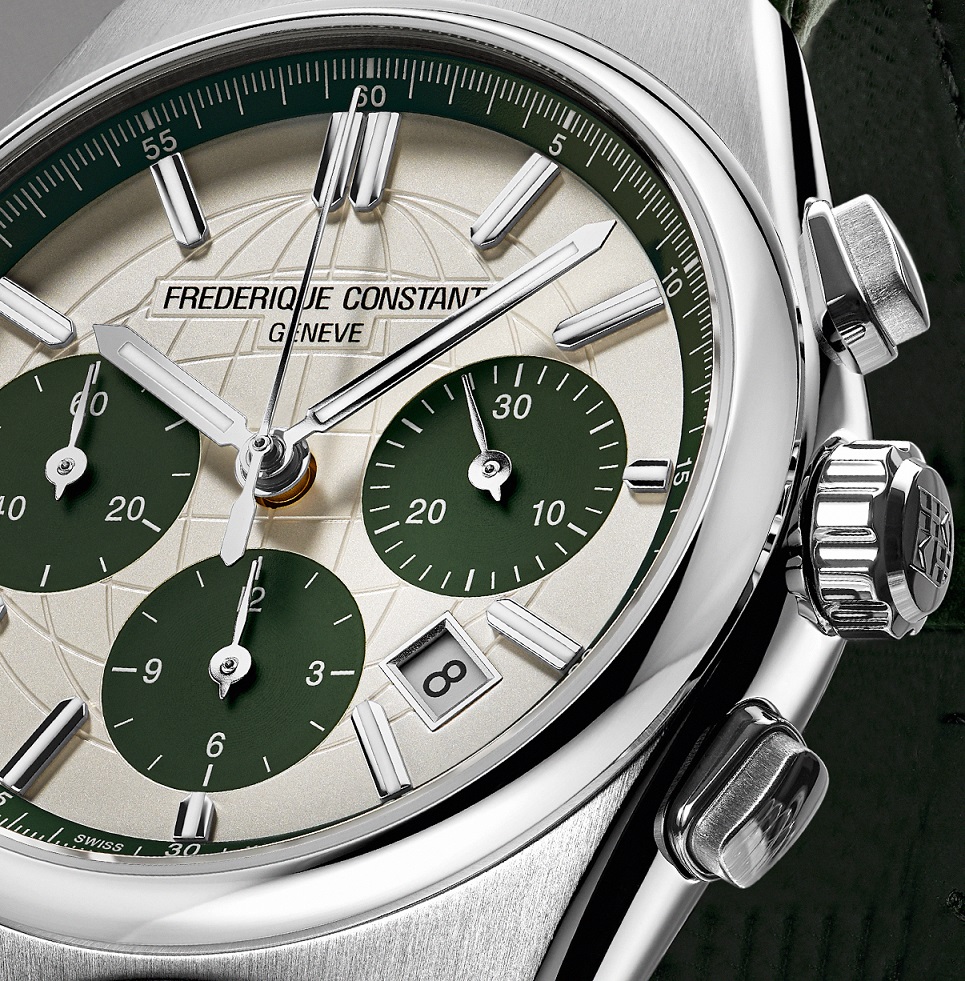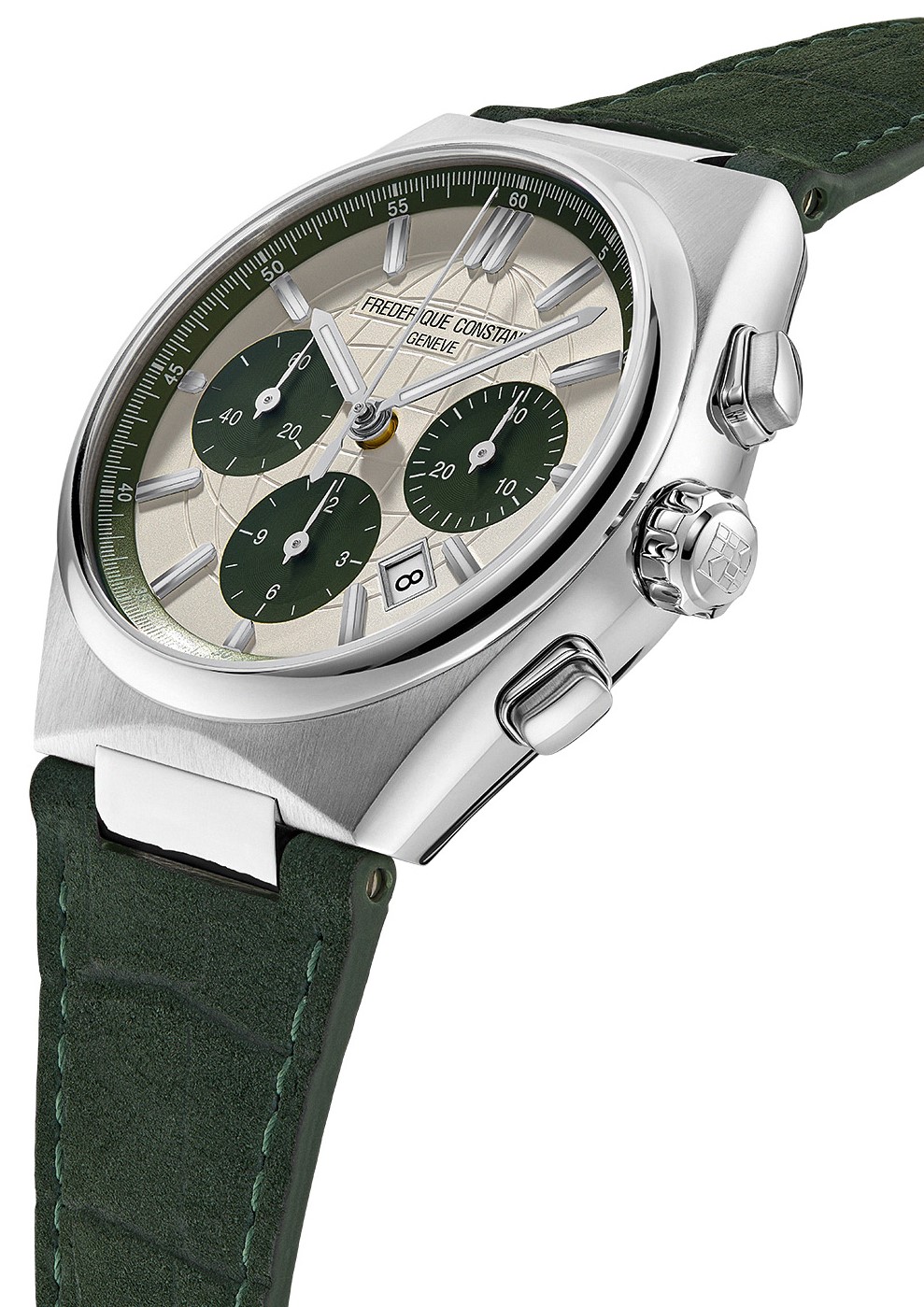 Frederique Constant Highlife Automatic Chronograph Limited Edition FC-391SGR4NH6 jsou pánské automatické hodinky na integrovaném koženém zeleném řemínku s trnovou sponou. Jedná se o limitovanou edici v počtu 1888 kusů pro celý svět. Pouzdro z nerezové oceli má průměr 41 milimetrů, průhledné dýnko a signovanou korunku. Tyto univerzální hodinky ve sportovně-elegantním designu využijete pro každodenní nošení. Bílo-zelený číselník s motivem zeměkoule, chronografem a indikací data je chráněn odolným safírovým sklem s antireflexní vrstvou. Aplikované hodinové indexy jsou společně s ručkami pokryty luminiscenčním nátěrem Super-LumiNova®, který garantuje perfektní čitelnost za zhoršených světelných podmínek. Pohon hodinek zajišťuje mechanický strojek FC-391 s automatickým nátahem a rezervou chodu přibližně 60 hodin. Základem kalibru je La Joux-Perret LJPL110. Tento strojek s funkcí hackingu lze v případě potřeby natahovat i ručně pomocí korunky. S vodotěsností 10 ATM jsou vhodné pro koupání nebo šnorchlování. Součástí balení je náhradní pryžový řemínek a ocelový tah.