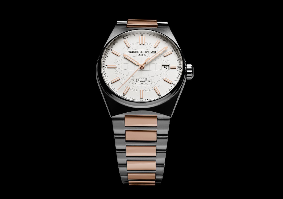 Frederique Constant Highlife Automatic COSC FC-303V4NH2B jsou pánské automatické hodinky na integrovaném ocelovém bicolor náramku s částečnou PVD úpravou v barvě růžového zlata a motýlkovou sponou. Pouzdro z nerezové oceli má průměr 41 milimetrů, průhledné dýnko a vnější lunetu i korunku s PVD úpravou v barvě růžového zlata. Tyto univerzální hodinky v klasickém designu využijete pro každodenní nošení. Bílý číselník s motivem zeměkoule a indikací data je chráněn odolným safírovým sklem s antireflexní vrstvou. Aplikované hodinové indexy jsou společně s ručkami pokryty luminiscenčním nátěrem Super-LumiNova®, který garantuje perfektní čitelnost za zhoršených světelných podmínek. Pohon hodinek zajišťuje mechanický strojek FC-303 s automatickým nátahem a rezervou chodu přibližně 38 hodin. Základem kalibru je Sellita SW200. Tento strojek s funkcí hackingu lze v případě potřeby natahovat i ručně pomocí korunky. Hodinky s C.O.S.C. certifikací, která je zárukou vysoké přesnosti, nesou označení „Chronometer“. S vodotěsností 5 ATM jsou odolné proti dešti a při sprchování. Součástí balení je náhradní pryžový řemínek hnědé barvy.