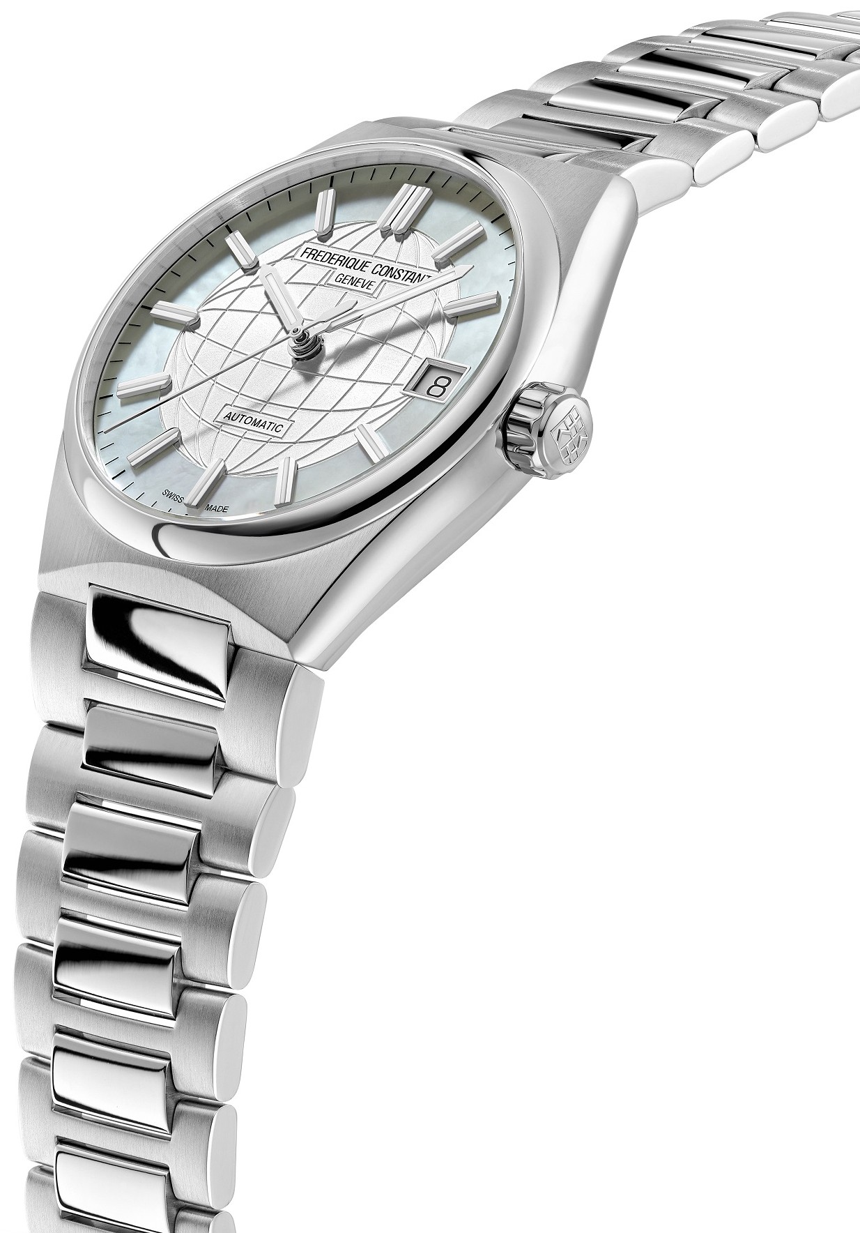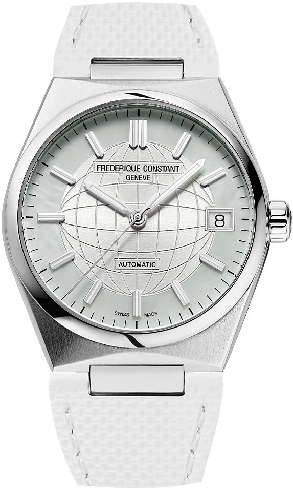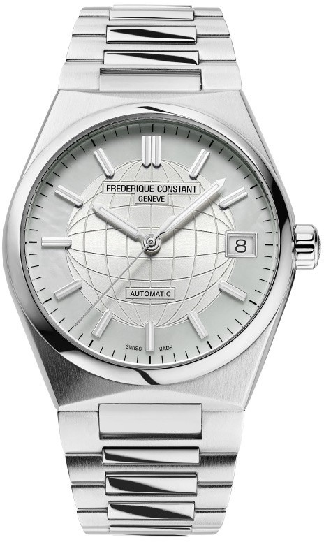Frederique Constant Highlife Ladies Automatic FC-303MPW2NH6B jsou dámské automatické hodinky na integrovaném ocelovém náramku v kombinaci brusu a lesku s motýlkovou sponou. Pouzdro z nerezové oceli má průměr 34 milimetrů, signovanou korunku a průhledné dýnko. Tyto univerzální hodinky v klasickém designu využijete pro každodenní nošení. Perleťový číselník s motivem zeměkoule ve stříbrné barvě je chráněn odolným safírovým sklem. Aplikované hodinové indexy jsou společně s ručkami pokryty luminiscenčním nátěrem Super-LumiNova®, který garantuje perfektní čitelnost za zhoršených světelných podmínek. Pohon hodinek zajišťuje mechanický strojek FC-303 s automatickým nátahem a rezervou chodu přibližně 38 hodin. Základem kalibru je Sellita SW200. Tento strojek s funkcí hackingu lze v případě potřeby natahovat i ručně pomocí korunky. Hodinky disponují funkcí ukazatele data a s vodotěsností 5 ATM jsou odolné proti dešti a při sprchování. Součástí balení je náhradní pryžový řemínek bílé barvy.
