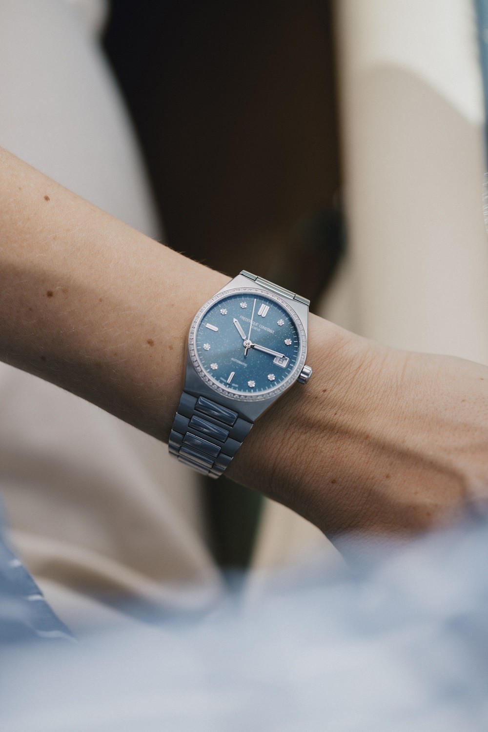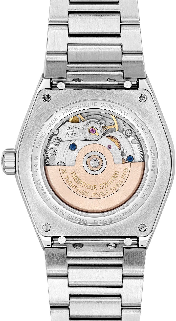 Frederique Constant Highlife Ladies Automatic Sparkling Limited Edition FC-303LBSD2NHD6B jsou dámské automatické hodinky na integrovaném ocelovém náramku v kombinaci brusu a lesku s motýlkovou sponou. Jedná se o limitovanou edici v počtu 888 kusů pro celý svět. Pouzdro z nerezové oceli má průměr 34 milimetrů, signovanou korunku, průhledné dýnko a lunetu osazenou 60 diamanty o hmotnosti 0,45 ct. Tyto univerzální hodinky v klasickém designu využijete pro každodenní nošení, i do společnosti. Modrý třpytivý číselník zdobený 8 diamanty o hmotnosti 0,04 ct je chráněn odolným safírovým sklem. Aplikované hodinové indexy jsou společně s ručkami pokryty luminiscenčním nátěrem Super-LumiNova®, který garantuje perfektní čitelnost za zhoršených světelných podmínek. Pohon hodinek zajišťuje mechanický strojek FC-303 s automatickým nátahem a rezervou chodu přibližně 38 hodin. Základem kalibru je Sellita SW200. Tento strojek s funkcí hackingu lze v případě potřeby natahovat i ručně pomocí korunky. Hodinky disponují funkcí ukazatele data a s vodotěsností 5 ATM jsou odolné proti dešti a při sprchování. Součástí balení je náhradní pryžový řemínek bílé barvy.
