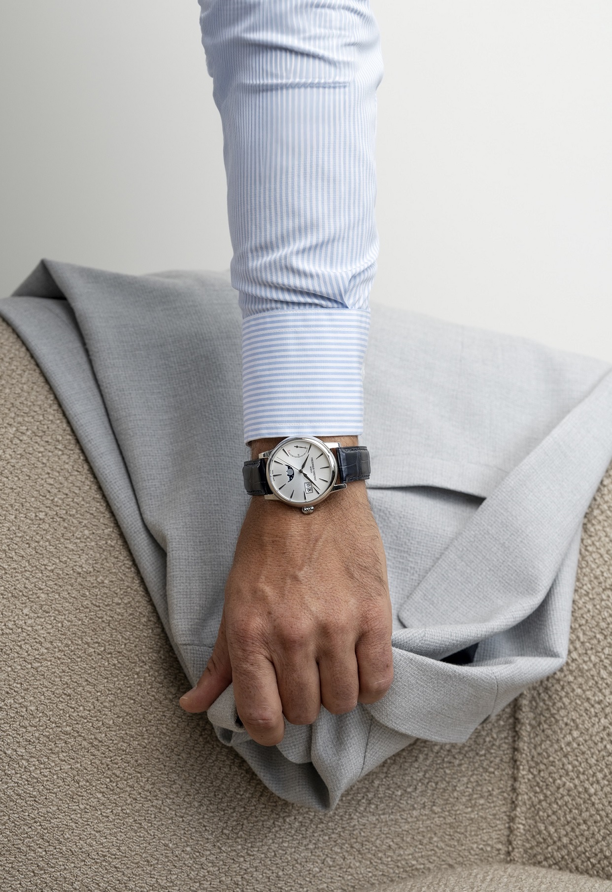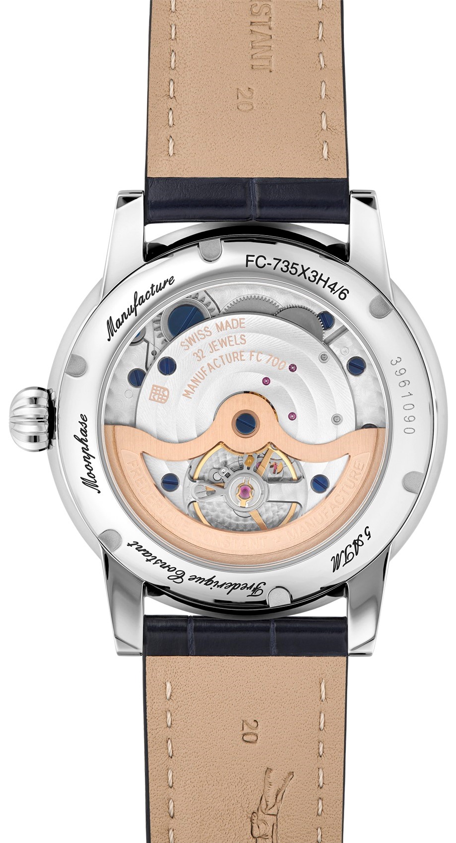 Frederique Constant Manufacture Classic Power Reserve Big Date FC-735S3H6 jsou pánské automatické hodinky na modrém řemínku z aligátoří kůže s překlápěcí sponou. Pouzdro z nerezové oceli má průměr 40 milimetrů, průhledné dýnko a zdobenou korunku. Tyto elegantní hodinky jsou vhodnou volbou pro každodenní nošení. Stříbrný číselník s efektem slunečního brusu, indikací data v provedení big date, ukazatelem rezervy nátahu a indikací měsíční fáze je chráněn odolným safírovým sklem. Pohon hodinek zajišťuje manufakturní strojek FC-735 s automatickým nátahem a rezervou chodu přibližně 50 hodin. Tento strojek s funkcí hackingu lze v případě potřeby natahovat i ručně pomocí korunky. Vodotěsnost hodinek činí 5 ATM a jsou tedy odolné proti dešti a při sprchování.