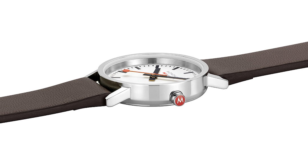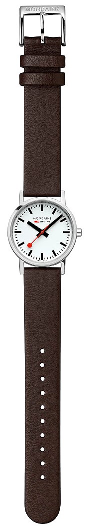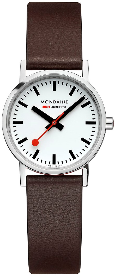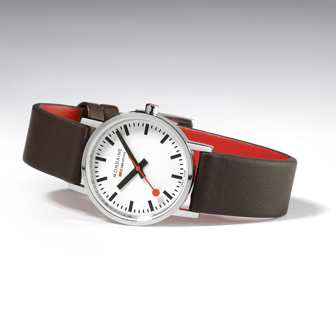 MONDAINE Classic A658.30323.11SBGV jsou dámské hodinky na hnědém řemínku z veganské kůže s trnovou sponou. Pouzdro z nerezové oceli má průměr 30 milimetrů. Přehledný bílý číselník je chráněn minerálním sklíčkem a je inspirován ikonickými nádražními hodinami s červenou sekundovou ručkou. Pohon hodinek zajišťuje quartzový strojek Ronda 513. S vodotěsností 3 ATM jsou hodinky odolné proti dešti a při mytí rukou.