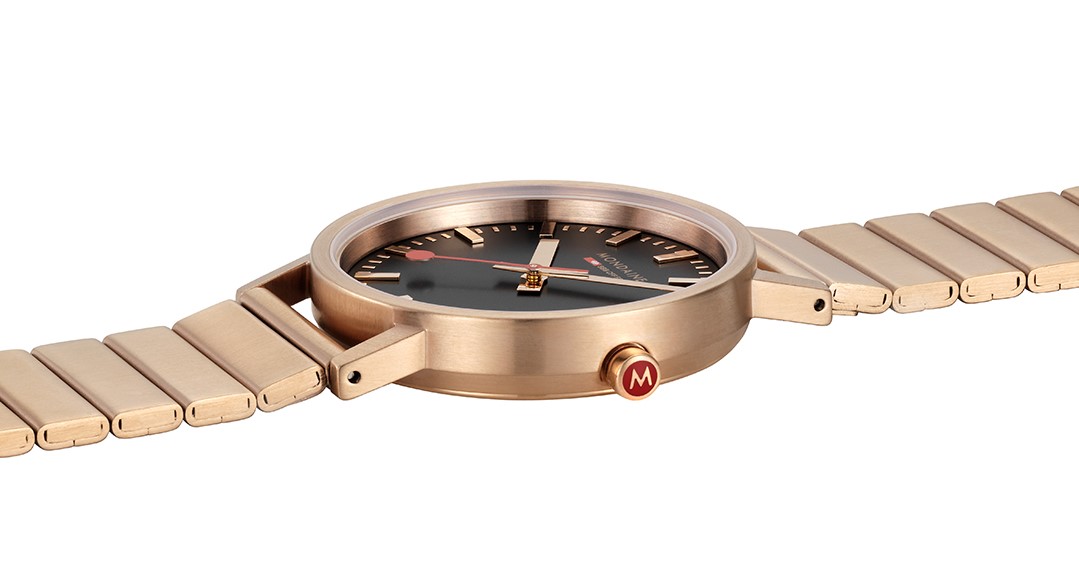 MONDAINE Classic A660.30314.16SBR jsou dámské hodinky v klasickém stylu na ocelovém náramku s povrchovou PVD úpravou v barvě růžového zlata a posuvnou sponou. Pouzdro z nerezové oceli ve stejné barvě má průměr 36 milimetrů. Přehledný černý číselník je chráněn minerálním sklíčkem a je inspirován ikonickými nádražními hodinami s červenou sekundovou ručkou. Pohon hodinek zajišťuje quartzový strojek Ronda 513. S vodotěsností 3 ATM jsou hodinky odolné proti dešti a při mytí rukou.