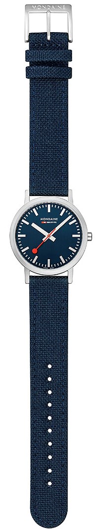 MONDAINE Classic A660.30314.40SBD jsou dámské hodinky na modrém textilním řemínku z recyklovaných PET lahví s korkovou podšívkou a trnovou sponou. Pouzdro z nerezové oceli má průměr 36 milimetrů. Přehledný modrý číselník je chráněn minerálním sklíčkem a je inspirován ikonickými nádražními hodinami s červenou sekundovou ručkou. Pohon hodinek zajišťuje quartzový strojek Ronda 513. S vodotěsností 3 ATM jsou hodinky odolné proti dešti a při mytí rukou.