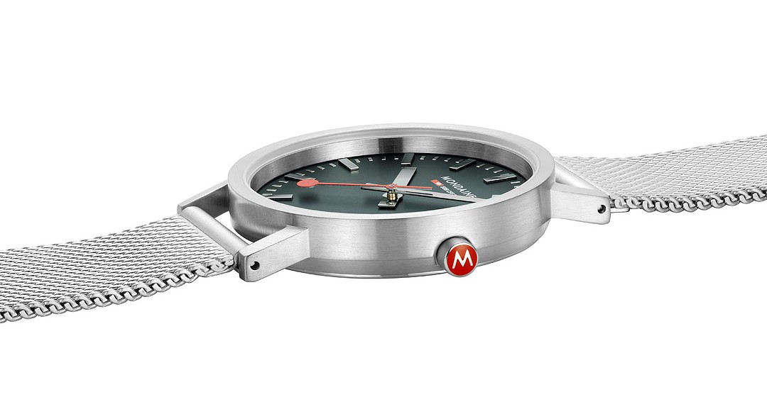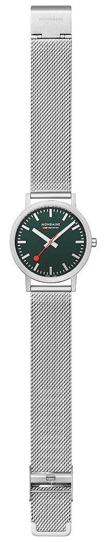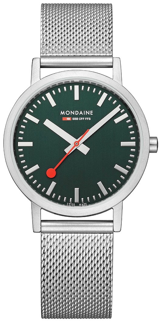 MONDAINE Classic A660.30314.60SBJ jsou dámské elegantní hodinky na ocelovém milánském tahu s posuvnou sponou. Pouzdro z nerezové oceli má průměr 36 milimetrů. Přehledný zelený číselník je chráněn minerálním sklíčkem a je inspirován ikonickými nádražními hodinami s červenou sekundovou ručkou. Pohon hodinek zajišťuje quartzový strojek Ronda 513. S vodotěsností 3 ATM jsou hodinky odolné proti dešti a při mytí rukou.