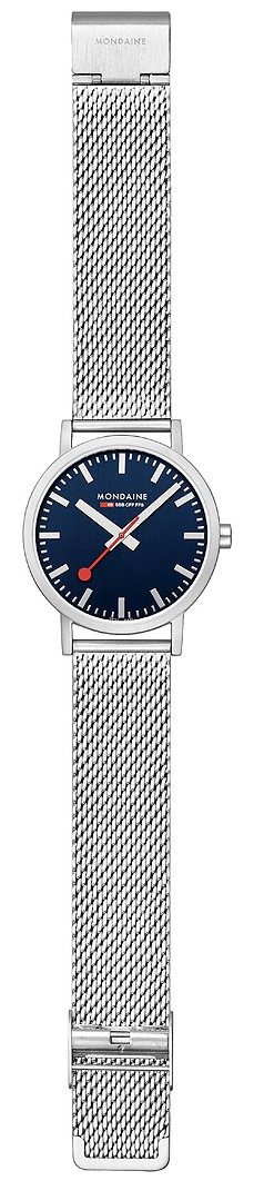 MONDAINE Classic A660.30360.40SBJ jsou pánské elegantní hodinky na ocelovém milánském tahu s posuvnou sponou. Pouzdro z nerezové oceli má průměr 40 milimetrů. Přehledný modrý číselník je chráněn minerálním sklíčkem a je inspirován ikonickými nádražními hodinami s červenou sekundovou ručkou. Pohon hodinek zajišťuje quartzový strojek Ronda 513. S vodotěsností 3 ATM jsou hodinky odolné proti dešti a při mytí rukou.