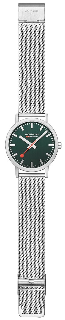 MONDAINE Classic A660.30360.60SBJ jsou pánské elegantní hodinky na ocelovém milánském tahu s posuvnou sponou. Pouzdro z nerezové oceli má průměr 40 milimetrů. Přehledný zelený číselník je chráněn minerálním sklíčkem a je inspirován ikonickými nádražními hodinami s červenou sekundovou ručkou. Pohon hodinek zajišťuje quartzový strojek Ronda 513. S vodotěsností 3 ATM jsou hodinky odolné proti dešti a při mytí rukou.